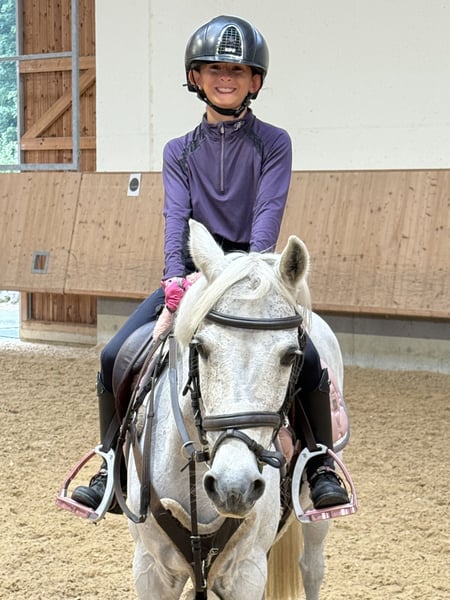 Our sweet Creamy is looking for a new little rider. She is what one would call a perfect children's pony: a child can groom her completely on their own, she doesn't spook, doesn't stare, and has absolutely no bad habits. She is a little jumping machine and never stops. The best confidence giver for kids. A true schoolmaster pony. She is 23 years old, 127 cm tall, and an absolute angel. A fit little dream pony that safely carries children through the course at competitions and always crosses the finish line. Always kind, always well-behaved. Unfortunately, we have to part with her because she reacts to our straw bedding with coughing, and we cannot change that. For mild Cushing, she receives a tablet every day and has no problems with it at all.
