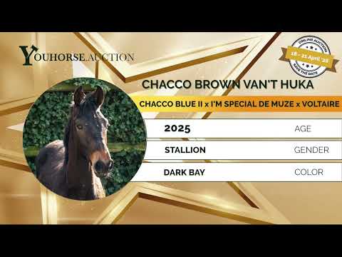 Paard met uitstraling en veel bloed. Toont veel macht op de sprong met veel vermogen en een goede techniek. Voorzichtig en met een zeer goede instelling. Paard met een groot hart en de mentaliteit om te presteren. Echt sportpaard voor de toekomst. Vader Chacco Blue II – 1.65m Moeder Imke Z (v. I’m Special de Muze – 1.50m) Moederlijn / stam Sterke internationale prestatiestam. Grootmoeder Cleo (v. Voltaire – 1.60m) gaf o.a.: – Cica Z – 1.50m – Luna 11 – 1.40m Verder opgebouwd uit bewezen 1.60m bloed via Chacco-Blue, Emerald van ’t Ruytershof en Voltaire, met meerdere paarden op 1.40m–1.60m niveau in de directe lijn.