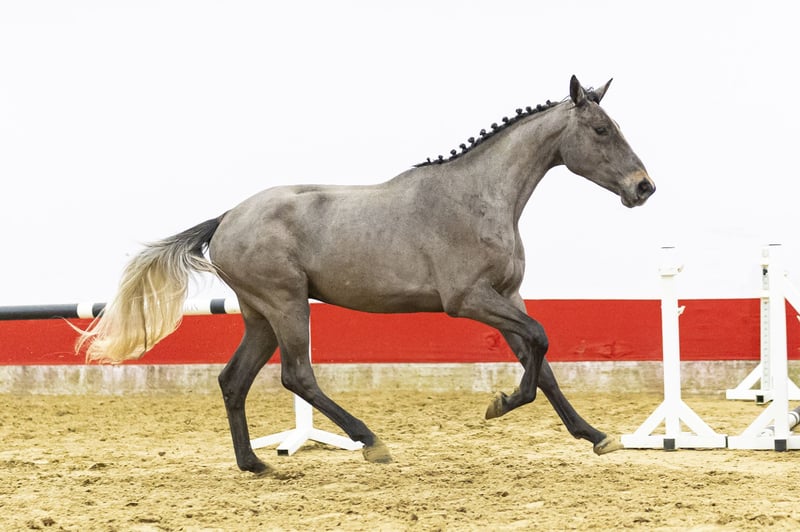 Beautiful dark grey with a modern type. He has a calm character and stays level-headed in his work. He shows a very attractive jumping style with notably strong front-end technique. Jumps well with the withers coming back and finishes the fence good. Just almost two years and already jumping full lines with ease. Shows scope naturally and plenty of commitment. Quick off the ground and consistent in his technique. A quality horse with the mindset for further development.