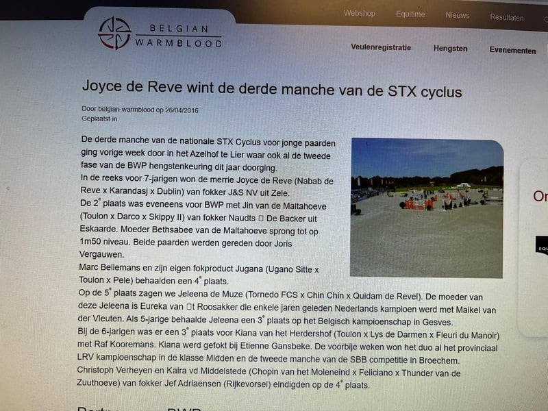 European Sport Horse Auction ESHA organizes multiple horse sales auctions for promising show jumpers, dressage horses, foals, broodmares, semen, embryos... The auctions are online and/or in different locations. ESHA gives everybody the chance to buy promising horses in a no-nonsense way at realistic prices from the extensive collections. In the meanwhile, please take a look at our website esha.horse for all the info, photo, video, examinations,... about the horses in the auctions. We have interesting new selections every few weeks. You can also contact the auction via e-mail info(at)esha.horse. ALL INFO AT WWW.ESHA.HORSE. Contact preferably via email or Whatsapp message.