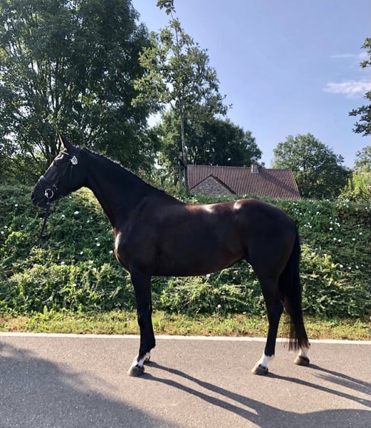 Elegant Belgian Warmblood Mare – 2017, Black, 173 cm We are pleased to offer this stunning Belgian Warmblood mare (Don Nobless x Donnerhall x Rubinstein), born in 2017. Standing at a impressive 173 cm, she combines size, presence, and athleticism, making her an excellent choice for breeding. She's pictured here as a 4 year old. Her striking black coat and noble appearance are complemented by her excellent conformation. . This mare was ridden as a young horse and used as a breeding mare afterwards. She produced two healthy strong and big foals. She has a calm, willing temperament. She's offered for sale because we want to downsize our breeding program.