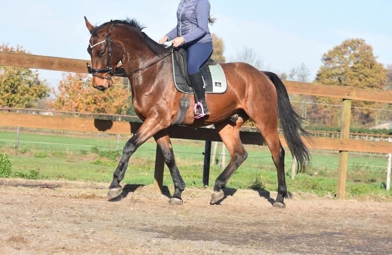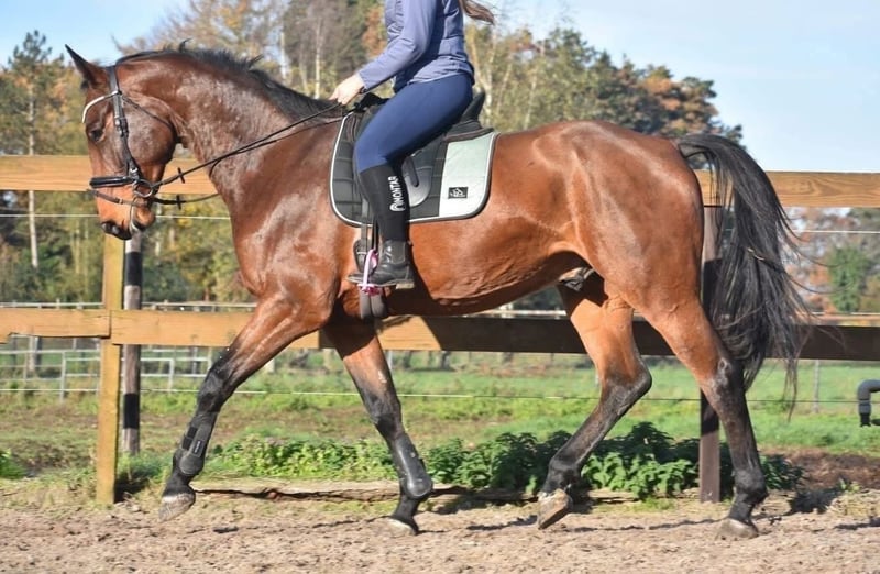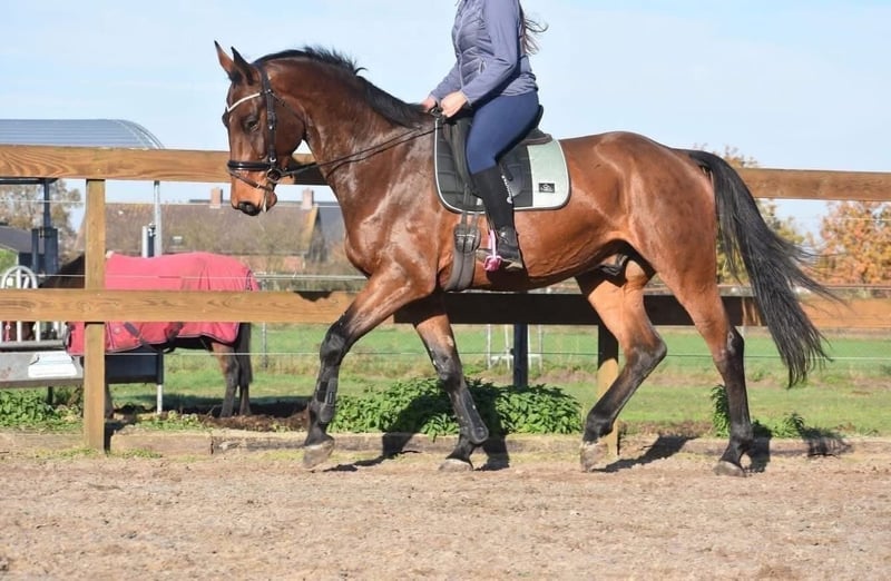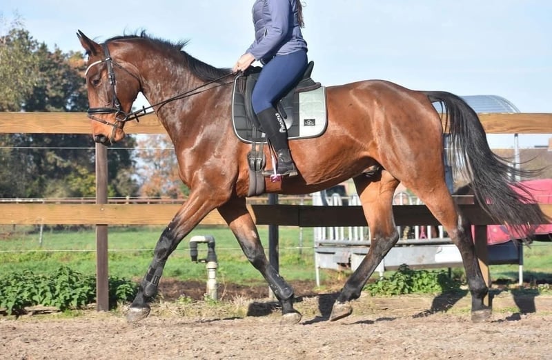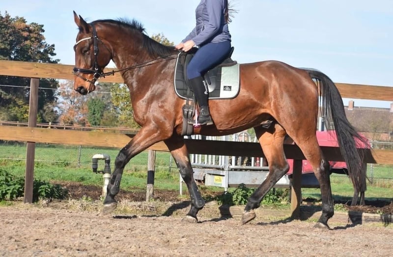 Rechtstreeks van de fokker mochten wij hem overnemen, samen met stalgenootje Valesco vd Melane. Ontmoet Voltaire van de Melane, een imposante en elegante 5-jarige ruin van ca. 1.75m, met een uitstekende afstamming: Querido VG x Concorde Z x Tresor D 12. Klik HIER voor zijn papier. Een paard met een mooie toekomst , geschikt voor zowel sport ( dressuur+ springen) als recreatie. Voltaire is prachtig gebouwd en beschikt over veel uitstraling en souplesse. Het is een vriendelijk, vrolijk en positief paard. Onder het zadel laat hij hier zijn natuurlijke balans en meewerkende karakter zien. Hij zoekt fijn de verbinding met de ruiter en is prettig te rijden. Hij is hier en voorheen goed verkeers,- en trailermak. Heel erg sociaal. Vrij van ( stal) gebreken. Voltaire is kerngezond en kan enorm goed bewegen, met veel cadans , balans en ruimte. Hij is röntgenologisch en klinisch goedgekeurd, zowel de benen als rug en hals. Is onlangs door de tandarts behandeld, in bezit van een recent rapport. € 9750,- incl. merkzadel en hoofdstel compleet.