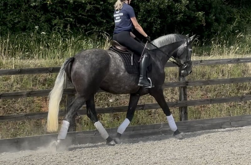 Hallie verfügt über ein wunderbares Temperament, ist eine unkomplizierte Stute, sehr willig und ehrlich. Sie hat eine starke, bewährte Mutterlinie, ausgezeichnete Konformation und Bewegung. Collaton Haldora, geboren am 17.06.2021, 16,2 hh https://www.horsetelex.com/horses/pedigree/2249468/collaton-haldora Hallie ist ein hochwertiges, junges Pferd. Sie ist im Heimatstall gezogen und ihre vollständige Abstammung ist seit Fohlenzeit bekannt. Hallie vereint alles: ein wunderbares Temperament, drei korrekte, athletische Gänge. Sie besitzt viel Blut und wurde für Vielseitigkeit gezüchtet, würde aber in jeder Disziplin hervorragend sein. Im Dezember 2024 wurde sie als Dreijährige leicht angeritten und anschließend zur weiteren Entwicklung zurückgestellt. Sie ist jetzt bereit, ihre Ausbildung fortzusetzen, und wurde im Mai wieder in Arbeit genommen. Sie hat seitdem drei- bis viermal pro Woche kleine Arbeiten absolviert und ist nun wieder etwas intensiver im Training. Sie wurde longiert, auf ruhigen Wegen allein und in Gesellschaft geritten, sowie im Gelände geführt. Sie wurde im Roundpen und in der Reithalle ausgebildet, außerdem im Gelände an der Longe gearbeitet, inklusive Stangenarbeit. Im letzten Monat hat sie mit dem Springen unter dem Sattel begonnen – Video hier: https://youtu.be/glMo5Pw7fCY?si=XmlHj5dm2owzW1R5 Hallie wurde nie gedrängt oder überfordert. Als im Heimatstall gezogene Stute wurde sie seit dem ersten Tag gut behandelt und bestens aufgezogen. Sie hat viel Bodenarbeit und Horsemanship-Training genossen. Auf einer kleinen Weide- oder Pensionsstelle hat sie Kontakt zu Traktoren, großen Fahrzeugen, viel Lärm, Hunden, Hühnern und Enten gehabt. Sie kann alleine in den Stall gebracht werden, ist aber auch glücklich, wenn sie von ihren Freunden getrennt ist, und verbringt den Tag ruhig im Stall, wenn sie die einzige Stute auf der Anlage ist. Sie hat im Roundpen und unter dem Sattel gezeigt, dass sie großes Potenzial hat, ist mutig und hat eine gute Technik über dem Hindernis mit viel Sprungkraft. Dieses Fohlen stammt aus einer hervorragenden, bewährten Mutterlinie, einer britischen Warmblutmutter. Ihr Vater hat bis auf BE Novice-Niveau im Wettkampf gezeigt. Er verleiht seinen Nachkommen gute Trainierbarkeit, Temperament, Fähigkeit und Bereitschaft. Hallie lässt sich gut verladen und reisen, ist beim Hufschmied, Tierarzt, bei Wurmkuren und Impfungen zuverlässig. Sie hat saubere Gliedmaßen und ist frei von Vorerkrankungen. Diese Stute zeigt alle Eigenschaften eines Top-Pferdes: ein ausgeglichenes, mutiges Wesen, mit einer positiven Lebenseinstellung, ruhig, vorausschauend und gelassen. Fotos vom Fohlenalter bis zu 4 Jahren sind auf der Facebook-Seite von Collaton Farm & Livery Yard verfügbar. Sie ist offen für eine tierärztliche Untersuchung – hat den Check bestanden. Reisepass registriert bei WBS (UK) und zusätzlich abgestempelt bei SHB(GB). Im Dezember 2024, 3 Jahre alt, unter dem Sattel – https://www.facebook.com/reel/1098050421993362/ Springen im Freilauf als 3-Jährige – https://youtu.be/SkNEAUbDE9U?si=jylGD1dgWtJYRW-5 Sommer 2024, 3 Jahre alt – https://youtu.be/oCZkD3uqH6Y?si=qfhRu-ArDnw1iA1H Weitere Videos vom Fohlen bis 4 Jahre sind auf dem YouTube-Kanal verfügbar: https://www.youtube.com/@Collatonfarm