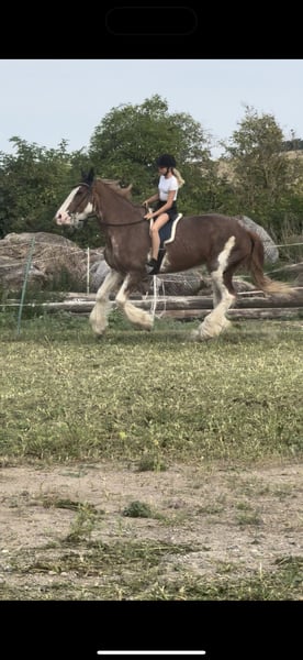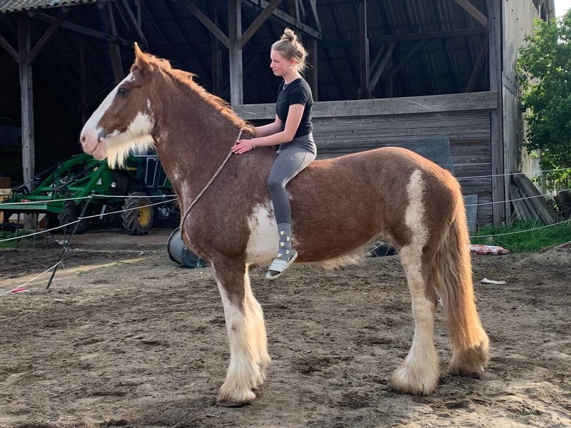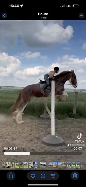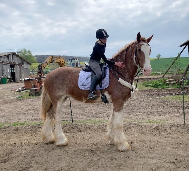 Supra es una yegua Clydesdale de 15 años con una impresionante alzada de 1,80 m. A pesar de su tamaño, es una verdadera todoterreno: salta de manera confiable, disfruta de paseos relajados por el campo y se deja montar incluso con riendas de cuello o sin silla. Con su carácter tranquilo y valiente, también es ideal para niños: incluso los más pequeños pueden montar sobre ella. Supra es muy cariñosa con las personas, le encantan los niños y está lista para cualquier diversión. Es perfecta para jinetes de ocio que buscan un caballo confiable, amable y versátil, que brinde mucha alegría tanto en el campo como en la pista.