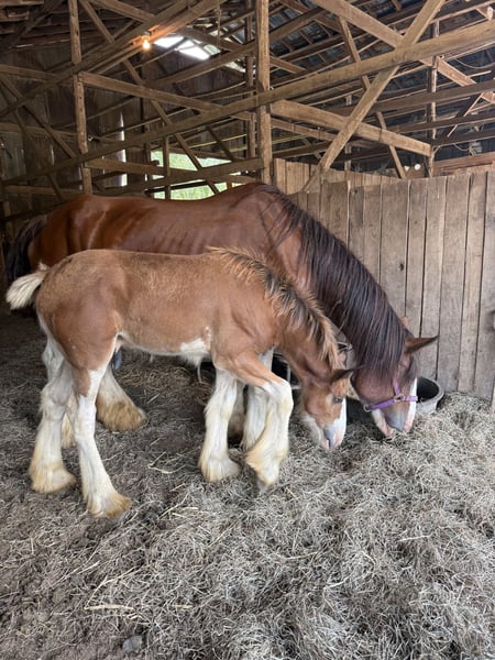 Beautiful 9-year-old, 16h Clydesdale mare selling with her 4-month-old filly. Mare is broke to ride, very family safe, and has flashy color with classic feather. Sweet and sound. Filly is strong, healthy, and showing the same quiet nature. Selling as a pair only.