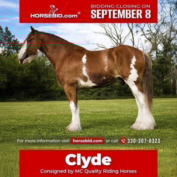♦️ 𝐭𝐡𝐞 𝐒𝐞𝐩𝐭𝐞𝐦𝐛𝐞𝐫 𝑺𝒆𝒍𝒆𝒄𝒕 ♦️ Happening now thru MONDAY | SEPTEMBER 8th - Available EXCLUSIVELY on HorseBid's website! For more details and to register visit: www.Horsebid.com CONSIGNOR CONTACT: MC Quality Riding Horses 330-307-0323 LOCATION: Battle Creek, IA BREED: Clydesdale REGISTERED: No COLOR: bay (a deep mahogany brown) with white markings on the face and legs HEIGHT: 17 AGE: 5 GENDER: Gelding If you are looking for an iconic, unique, memorable Icon, to be staple part of your family for many years to come – don’t miss out on Clyde. At 5 years old and 17 hands, he is strong and sturdy, yet easy to handle. If you’re looking for a horse that will take care of you every single ride, build your confidence, and absolutely loves people, Clyde is your guy. He rides & drives the absolute best. Clyde is very gentle to handle in all aspects. He rides around like an old horse and is wide beyond his years but he has no problem moving out and will walk, trot, canter easily out in the fields and arena. He’s been on many trail rides and will go over and through all obstacles from mud, snow, ditches, and logs to water, bridges or barking dogs following him along. We have even moved cattle with him! He will gladly follow along on the trails or even go out alone. He stands to be groomed, mounted, saddled/harnessed, hitched, bridled, bathed, etc. He loves all kinds of attention. Clyde gets along with everyone in the pasture - He does great in the stall as well. He has a big & funny personality. He is a HUGE love bug. While driving he stands to be hitched. He has been to town many times, & he is traffic safe. He has no issues loading and unloading from different types of trailers. I can’t say enough good things about this guy as he can do it all and he takes care of you 100% of the time. He rides English, western, double, or even bareback with a halter. Clyde isn’t just a horse - he’s a once in a lifetime partner for someone who wants safety, reliability, and a big heart. Horses like him don’t come around often.