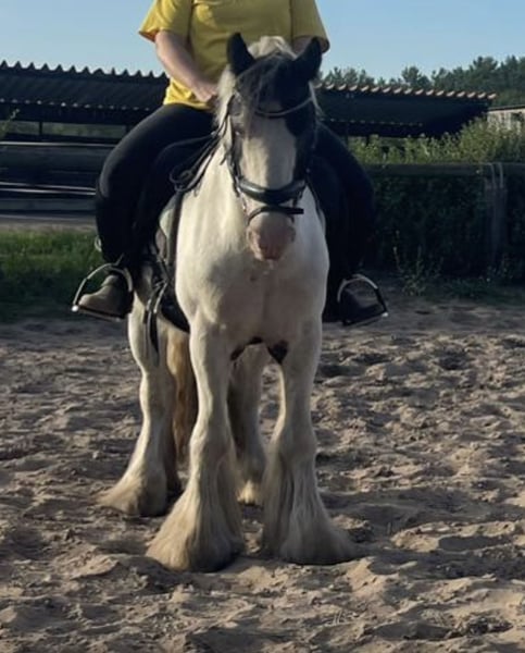 Te koop is deze prachtige 7-jarige Irish Cob ruin met een schofthoogte van ongeveer 145 cm. Cookie is waarschijnlijk de meest sympathieke en trouwe metgezel die je je maar kunt wensen. Zeer fijn aan de hulpen en goed uitgebalanceerd te rijden, en hij is erg ontspannen onderweg! Hij heeft een engelachtige geduld en absolute zenuwen van staal! Deze ruin overtuigt met zijn goede werkhouding en is bombproof, ook in het verkeer! Hij is ook eenspanig gereden! Hij kent het om hindernissen te overwinnen en houdt van buitenritten - Hij heeft ook al een paar cross-country parcours gelopen en toont veel plezier in het springen! Op Cookie is altijd vertrouwd, een echte maat waar je de hele dag mee kunt knuffelen! Hij houdt van aandacht en geniet van de aandacht van veel kinderen om zich heen! Bij buitenritten is hij zeer zenuwsterk en onbevreesd! Hij heeft een aangenaam en rustig tempo en is door elk kind te hanteren! Super knuffelig en mensgericht. Het absolute droompony voor herintreders, kinderen/junioren, rijscholen, maar ook inzetbaar als therapiepony! Kent groepsrijden en heeft daar geen probleem mee - loopt vooraan, in het midden, maar ook achteraan -