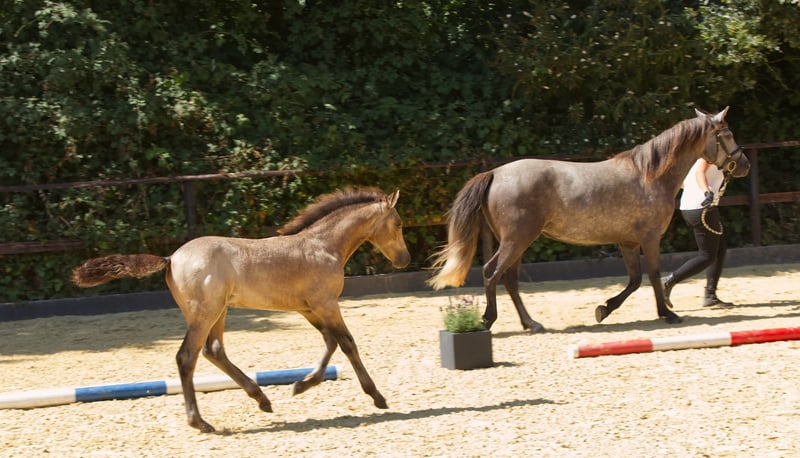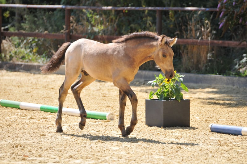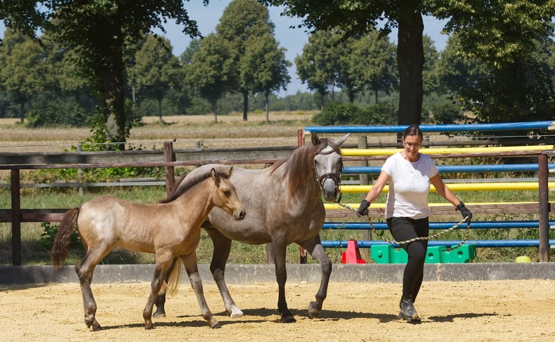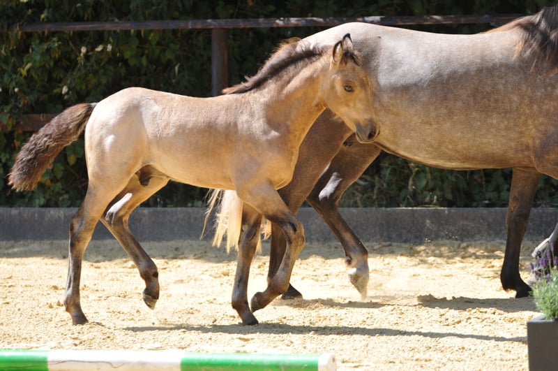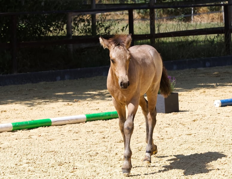 Our spring magic Roheryn was born on May 26, 2025. His mother, Goldie's Sarah, received the association premium from the ZfdP last year. She has expressive gaits and is characterized as an open-minded, curious, and strong-willed pony that is not easily disturbed. His father, RoosenhofsRoyalRock, is still at the beginning of his riding career. He possesses absolute nerve strength and has a good foundation. Additionally, he impresses with his three good basic gaits. Royal is registered in Stallion Book 2 with the ZfdP due to his height of 153 cm. We expect this pairing to produce an all-rounder that can be used in all areas of riding. Roheryn is a very large and strong foal in the desirable color buckskin, possibly even buckskin roan. Since his father is oversized and his mother is at the final height, he will likely reach at least the final height or be slightly taller. Our foals grow up in a species-appropriate manner, in a herd environment, and are mineralized with iWest. His HWSD status is N/N. Both parent animals can be viewed on-site. The last pictures show both parents. If everything fits, the little man can move to his new home after weaning.