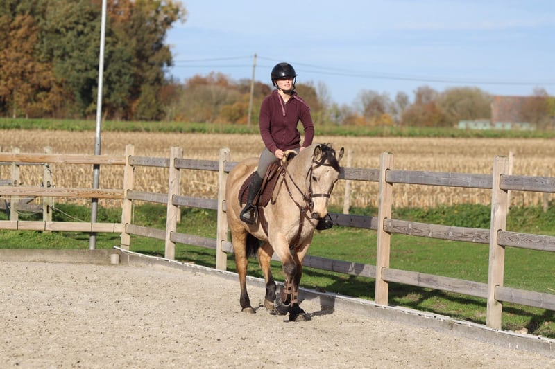 En manège, elle est sage, sociable et s'entend rapidement avec ses compagnons au pré. Elle apprécie également les promenades en extérieur et reste toujours coopérative et attentive.
