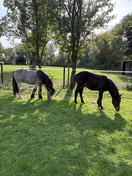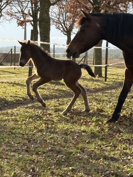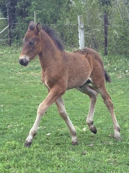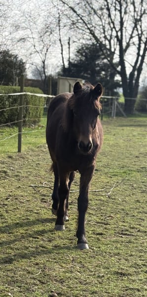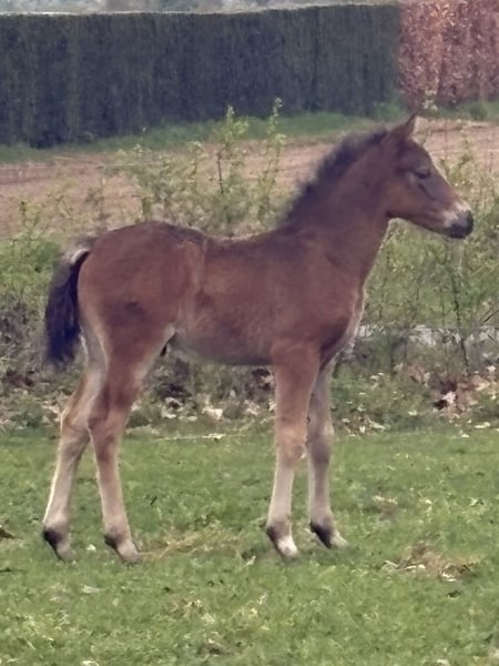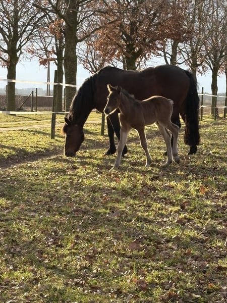 Der Kleine hat Geburtstag heute, seinen 1.. Er hat den Winter gut überstanden im Offenstall mit seinem Kumpel. Auffallend schön ist sein schwarzbraunes Fell ohne Abzeichen. Im Moment ist er 1,28m und wird das Ponyendmass erreichen. Er ist inzwischen kastriert und grundimmunisiert. Seine Eltern und Geschwister sind leistungsgeprüft und erfolgreich im Sport.