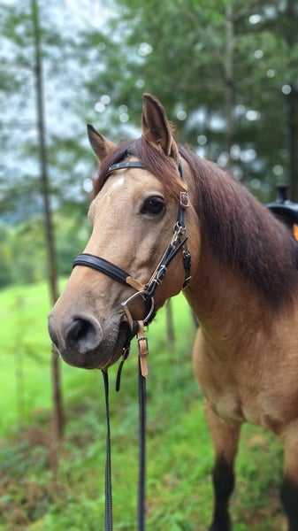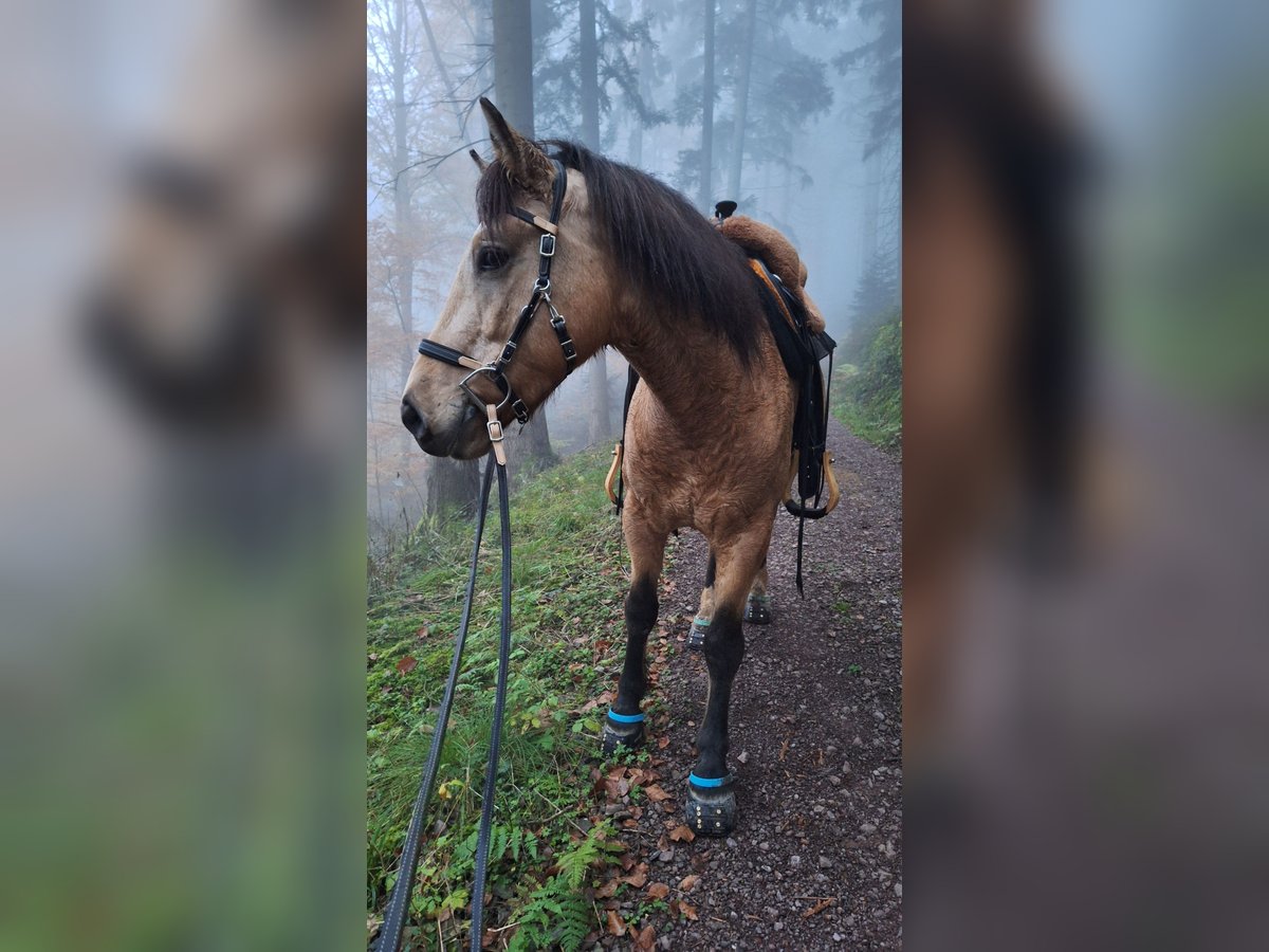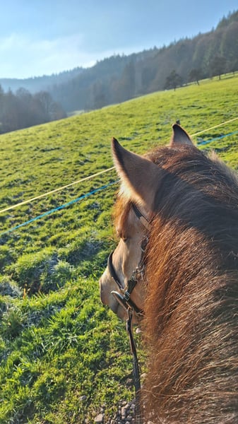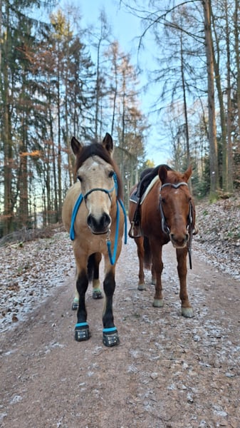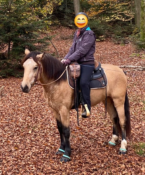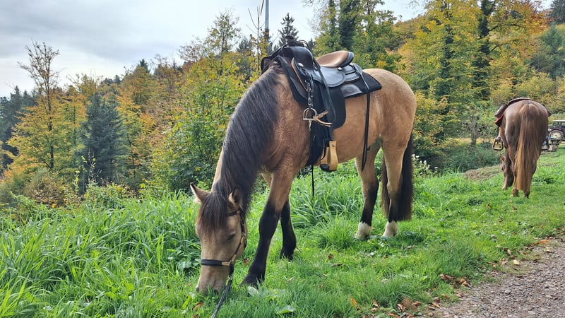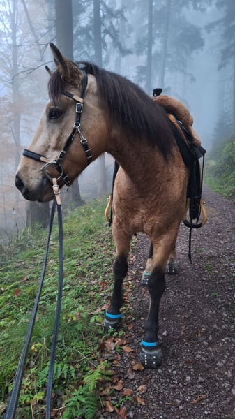 Ich verkaufe meinen 5 jährigen Connemara-Mix Wallach, ca. 145 cm, deckt gut ab, die Reiterin auf den Bildern ist 1,68 m. Er stammt von der Stutenmilchfarm Zollmann. Sein Vater ist der Connemarahengst Spirit. Ich habe ihn dort knapp 3jährig Ende 2023 als Hengst gekauft und habe ihn kastrieren lassen. Im Frühjahr 2024 wurde er von einem Horsemanship Trainer angeritten. Im Anschluss habe ich ihn langsam gestartet: auf dem Platz habe ich hauptsächlich Bodenarbeit mit ihm gemacht und im Gelände war ich anfänglich mit ihm spazieren. Nach und nach bin ich immer mehr geritten. Ende 2024 war er nochmal 2 Monate in Beritt. Letztes Jahr war ich viel mit ihm Ausreiten, alleine und in Gruppen. Im Sommer war ich 3 Tage mit ihm im Elsass bei einer Wanderreitstation und bin mit ihm dort ausgeritten. Das hat er toll gemeistert. Er ist trittsicher, unkompliziert, ausgeglichen, unerschrocken, clever und für jeden Spaß zu haben. Er hat gute Hufe, aber die Wege hier sind so steinig, dass er Hufschutz braucht. Im Gelände verwende ich deshalb Hufschuhe. Regelmäßig dem Schmied vorgestellt. Letzten Sommer habe ich ihn vorne insgesamt 4x beschlagen lassen: das hat von mal zu mal besser geklappt, aber er steht noch nicht vollkommen ruhig. Ich kann ihn alleine verladen. Bei mir war er nie ernsthaft krank. Im Winter steht er nachts in einer Box, tagsüber auf einem Paddock mit 8 anderen Pferden. Im Sommer ist er nur draußen. In der Herde hat er einen mittleren Rang. Ich verkaufe ihn, weil sich bei mir im Lauf des letzten Jahres einiges beruflich geändert hat und ich dadurch zu wenig Zeit für ein Jungpferd habe. Deshalb ist er bis Ende Februar wieder in Beritt. Die Trainerin sagt über ihn, dass er eine steile Lernkurve hat, dass Dinge, die man ihm erklärt/beigebracht hat, auch ungeübte Reiter abfragen können und dass er auch mal einen Fehler verzeiht. Wegen seinem jungen Alter ist er noch nicht für Anfänger geeignet und noch kein Gewichtsträger. Er wird nur in gute Hände verkauft. Im Preis ist sein Zubehör (Westernsattel, Trense, Pad, Decke, etc.) enthalten.