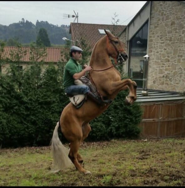 Verkauft wird eine Stute mit fabulösem Temperament, ausgebildet in der klassischen Dressur mit hochschulähnlichen Übungen. Sie ist tragend von einem kürzlich geborenen Fohlen. Das Pferd besitzt eine besondere Fellfarbe. Im Bild ist der Vater zu sehen, ein reinrassiger spanischer Pferdehengst mit schwarzem Fell.