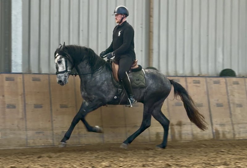 Name: Sanson-Sol Rasse: Cruzado, Kreuzung Geschlecht: Wallach Geburtsdatum: 31.03.2022 Alter: 4 Stockmaß: 1.58m Farbe: Schimmel Abstammung: ohne Abstammungsnachweis Charakter: menschenbezogen, lernwillig, neugierig, intelligent, mutig Ausbildung/Eignung: angeritten, Freizeit, Dressur, Barock, Working Equitation Geländeerfahrung: zuverlässig, unerschrocken, nervenstark, alleine und in der Gruppe Gesundheit: entwurmt, geimpft, Barhufer, ekzemfrei, Zähne kontrolliert, osteopathisch behandelt Haltung: Box, Paddock Besonderheiten: sehr sitzbequem, gute Grundgangarten, schmiede und verladefromm, herdenverträglich Die genannten Eigenschaften beruhen auf unserer persönlichen Einschätzung und stellen keine zugesicherten Merkmale dar. Preis: 6900€ (Bruttopreis) Haben wir ihr Interesse geweckt? Um Ihnen einen besseren Eindruck von Sanson zu geben, senden wir Ihnen sehr gerne sein Reitvideo zu. Selbstverständlich stehen wir Ihnen für eine ausführliche Beschreibung des Pferdes, persönliche Beratung und zur Beantwortung aller Ihrer Fragen auch telefonisch zur Verfügung. Bitte schreiben Sie uns hierfür jederzeit eine WhatsApp Nachricht, oder rufen unter folgender Telefonnummer an: +49 15119487595 Unsere Telefonzeiten sind täglich von 7:00 - 13:30 sowie ab 20:00Uhr. Wir freuen uns über Ihre Kontaktaufnahme! Eine klinische oder Röntgenologische Ankaufsuntersuchung kann gerne vom Tierarzt Ihrer Wahl durchgeführt werden. Natürlich kann Sanson sicher und komfortabel in sein neues Zuhause geliefert werden. Wir kümmern uns um alle notwendigen Vorbereitungen und den Transport, damit Ihr neues Pferd stressfrei, gut betreut, versichert und wohlbehalten im neuen Zuhause ankommt. Zurzeit präsentieren wir eine sorgfältig ausgewählte Vielfalt an Verkaufspferden. Bei uns finden Sie garantiert Ihr Traumpferd. Besuchen Sie uns auch gerne auf unserer Homepage unter: www.marvinsroyalhorses.de. Sehr geehrte Kunden, gerne stellen wir Ihnen unsere Pferde vor und führen, putzen, satteln, longieren, Bodenarbeit sowie Probereiten in der Reithalle, auf dem Platz oder im Gelände ist Ihnen möglich, um Ihr neues Familienmitglied näher kennenzulernen. Dieses kostet für ein Pferd 40€, für jedes weitere 30€ und wird beim Kauf wieder erstattet. Unsere Adresse lautet: Grube Ferdinand 50 53577 Neustadt Wied Google Maps: marvinsroyalhorses