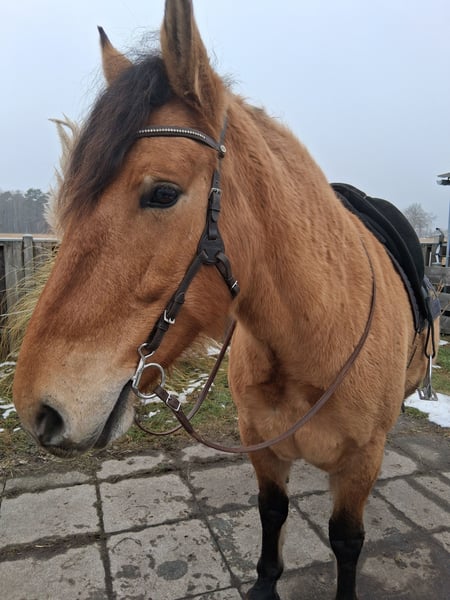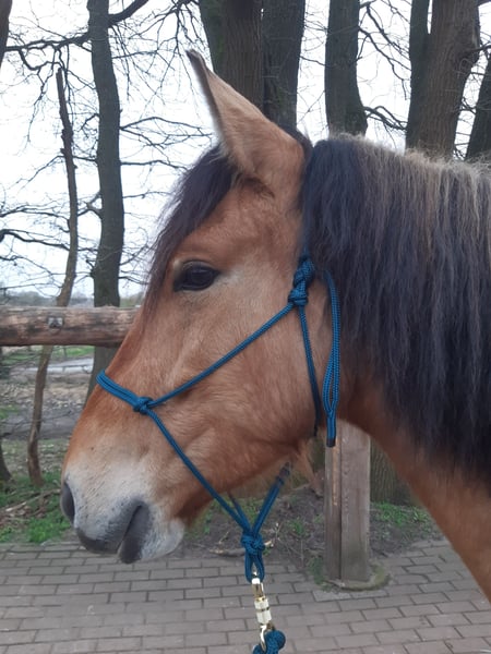 Cayetano, von mir Cayo genannt, ist ein sechs Jahre alter Cruzado Wallach (*2020). Mit der Fellfarbe Falbe (im Winter etwas dunkler wie Caramel), den hellen Strähnen in der Mähne, dem Aalstrich und den Zebrastreifen an den Beinen ist er ein absoluter Hingucker. Dazu kommt, dass er mit seinem stabilen Fundament und kräftigem Körperbau bei 1,56m Stockmaß ein Gewichtsträger ist. Cayo ist ein Freizeitpferd mit sehr sitzbequemen Gangarten. Der Trab ist butterweich zu sitzen. Er ist nach Horsemanship ausgebildet und wird dressurmäßig geritten. Vom Boden kennt er auch schon Schenkelweichen, Schulterherein, Konterschulterherein und parkt perfekt durch anlocken der Kruppe an der Aufstiegshilfe ein. Aus dem Sattel haben wir auch schon das Schulterherein angefangen. Er kennt es mit und ohne Gebiss geritten zu werden. Ebenfalls kennt er ein paar Trailhindernisse und die Pferdewippe. Aufgrund des Alters ist er kein Reitpferd für Anfänger oder für Kinder. Putzen und führen lässt er sich jedoch sehr gut von jüngeren und unerfahrenen Personen. Cayo benötigt einen erfahrenen Reiter, der sich in der Ausbildung von sensiblen Jungpferden auskennt und eine Einheit auch mal früher als geplant abbricht, da er gerade etwas neues gelernt hat und das im Kopf verarbeiten muss. Er lebt bei mir robust im Offenstall, auch bei -15°C ohne Decke. Er kennt auch die Boxenhaltung. Ich suche für Cayo ein neues Zuhause, in dem er sehr viel Auslauf zum Spielen und auch relaxen bekommt. Eine Unterbringung in der Box wäre möglich, jedoch sollte die Aufenthaltszeit im Freien größer sein. Vom Charakter her ist er ein sehr höfliches Pferd, aber auch sensibel. Er steht super brav am Anbinder, genießt das Putzen und gibt artig die Hufe. Wenn du Interesse an Cayo hast, freue ich mich über eine kurze Vorstellung von dir und der zukünftigen Haltungsform. Ich bin an einem guten Zuhause für Cayo interessiert und verkaufe nicht an Händler und Menschen, wo ich den Eindruck habe, dass er es dort nicht gut haben wird. Ich nehme mir gern Zeit, dir Cayo persönlich vorzustellen und gebe auch dir die Zeit ihn kennenzulernen. Um Reittourismus zum Wohle des Pferdes zu vermeiden, erlaube ich mir 15€ zu nehmen, die beim Kauf natürlich verrechnet werden. Mein Osteopath hat mich beim regelmäßigen Check darauf hingewiesen, dass sich bei Cayo momentan die Wachstumsfugen schließen und er für ein paar Monate so wenig wie möglich mit Reitergewicht belastet werden soll. Ein Probereiten ist daher nur kurz und nur im Schritt möglich und auch nur, wenn ich beim Kennenlernen merke, dass du als Käufer in Frage kommst.