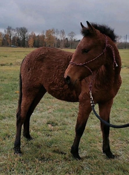 American Bashkir Curly mare, born in 2022, approximately 14.1 hh – with exceptional movement and a lot of personality With a heavy heart – for personal reasons – I am seeking a suitable, long-term home for my American Bashkir Curly mare. This is not an urgent sale. She is a young, very alert and personable mare with a strong presence. Curious, playful, yet attentive and sensitive in handling. She enjoys human contact very much and willingly allows grooming and handling. She is well-behaved, halter-trained, and easily led. She handles solo walks with her handler confidently and calmly. She is already familiar with ground work, as well as various environmental stimuli such as cars, dogs, and children. She was raised in a herd and is accustomed to both pasture and stable with paddock. She is very tidy in her stable. Within the herd, she establishes herself confidently and shows self-assurance. Farrier and veterinarian visits are no problem for her. She is loading well, healthy, vaccinated, and in excellent condition. Currently, she is being gradually and gently prepared for further training, appropriate to her age. Her movement is particularly noteworthy: She demonstrates good scope, rhythm, and a smooth, supple gait with additional quality. Color: Brown with year-round lightly curly Curly coat, dark legs Height: approx. 14.1 hh Awarded as a foal at licensing. Pedigree available; details gladly upon request. Transport can be arranged at an additional cost. Accessories can also be provided for an extra fee. Regularly vaccinated, dewormed, and in good health. The last three photos show her parents. Deliah Sire: Django – Black (Rappe) Dam: Desba – Brown