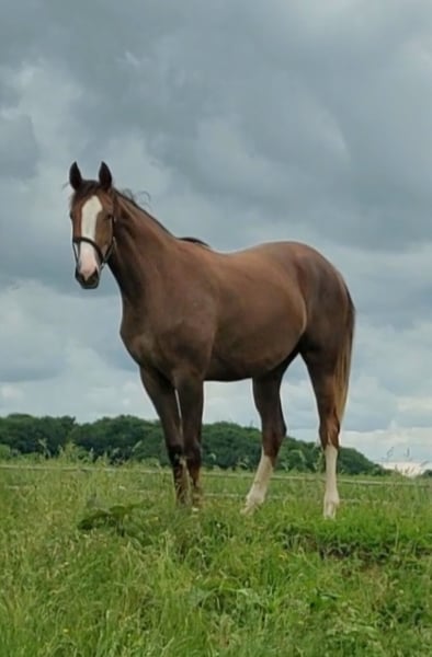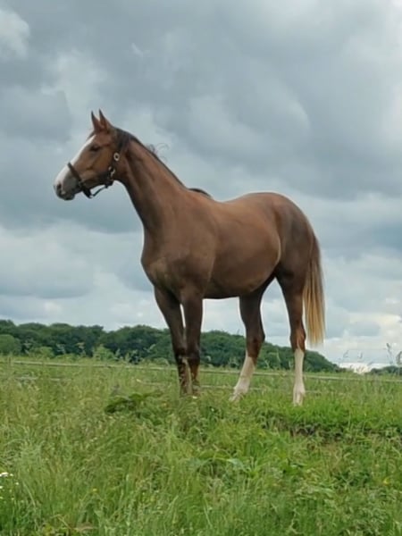 DRESSAGE SUBJECT. Do you want to shape your future dressage horse yourself from the start? Then Belicia is a good bet for a sensible, handsome young horse with 3 good and spacious gaits, which already seems very ready for the task. She is by the double Fløjhingst Be Sure with the Grand Prix stallions Benicio and Belissimo M as ff. and fff respectively. On the dam's side are the Grand Prix stallions Blue Hors Don Olymbrio and Glock's Romanov as mf. and mmf respectively. In July/August she was in professional training in connection with 2 years election in DV. She subsequently received a fine assessment and good characteristics to take home. In the mare line, "ALLERWELTSFRAU, Hannover Stutenstamm 4192002, Schridde 780", all mares are Main Stud Book mares with a great-grandmother who is a state prize winner in the German OLD. There are A and B horses in dressage in the line and several of them have passed the suitability test. Has been taken care of with everything and is in hands every day. Runs well in transport and has been easy to load. Goes out during the day and stands in the stall at night. Has red DV horse passport with full pedigree for breeding. Expected height 1.72 cm. Color: Dark Fuchs red FFS free. Inbreeding: 0.07 Trade examined and insured without remarks at the end of April 2024. Overall a comfortable and well-fed healthy 2-year-old mare with a good expression and a confident temperament.