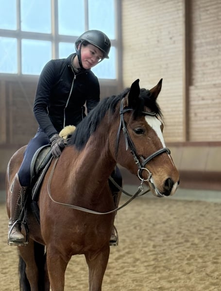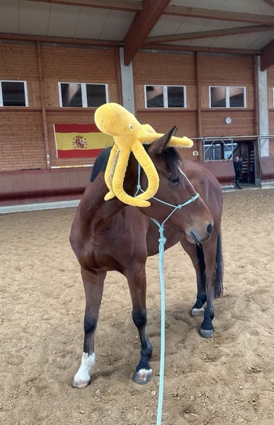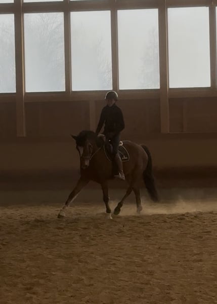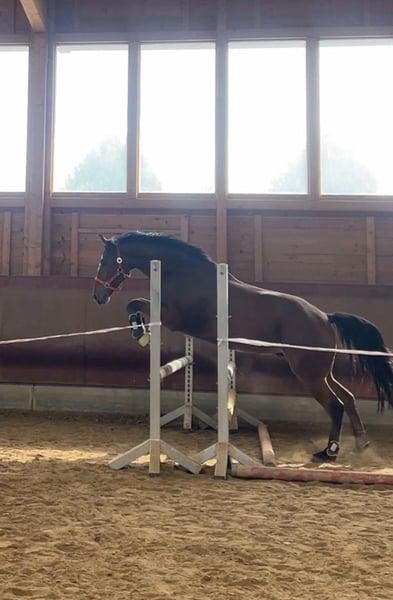 "Bobby Brown" is a 5-year-old, 15.3 hh gelding. Over the past few months, I have been riding him, and he shows motivation and attentiveness under saddle. Currently, he is ridden in walk, trot, and canter in the indoor arena and is beginning to jump small fences with the rider. However, this needs to be consolidated and further developed — a solid foundation is already in place. In terms of character, Bobby is an absolutely sweet and friendly fellow. He also impresses with his excellent basic gaits, in which he responds well to aids. At present, he is not suitable for beginners, as he is still in training and requires confident, consistent, and calm aids. Please inquire only if you have sufficient experience. What he already knows: - Calmness exercises with stuffed animals, tarps, and dual reins: he performs these relaxed and composed - Obedient lunging - Exposure to dogs, chickens, tractors as part of his daily routine - Short walks outside - Free jumping, initial pole work, and small jumps - Basic contact and some lateral work such as shoulder-in and bending Bobby grew up in a large herd on extensive pastures. He is currently housed in a box with a paddock and spends his days either playing with his gelding friends (four in total) or outside with my other mare. He has the best prerequisites to become a wonderful riding or even sport horse with patience and loving encouragement. Ideal for someone who enjoys training young horses and is looking for a friendly, unspoiled horse that is still in the early stages but shows potential and willingness to work. A recent, clear end-of-year health check (AKU) from late July is available. He can stay in training for further development. The price will increase with additional training.