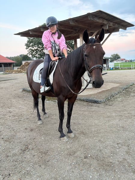Paola to piękna 14-letnia końska klacz typu endomasa, rasy pony, o wspaniałej budowie. Jest bardzo spokojna zarówno w obsłudze, jak i podczas jazdy. W terenie wykazuje już trochę energii. Opiekunowie Paoli szukają dla niej prawdziwego domu na całe życie. Od kiedy ma trzy lata, zawsze była pod opieką swoich właścicieli, niestety z powodów zdrowotnych muszą ją oddać. Sprzedajemy ją na nasze zlecenie, najlepiej dla kochającej rodziny. Bardzo dobrze sprawdziłaby się również jako koń towarzyszący, ponieważ świetnie dogaduje się z innymi końmi i jako partnerka w stadzie. Jest zdrowa, brała udział jedynie w krótkim treningu sportowym. Ma chip, jest zaszczepiona i odrobaczona. Koszt jazdy próbnej to 30 €.