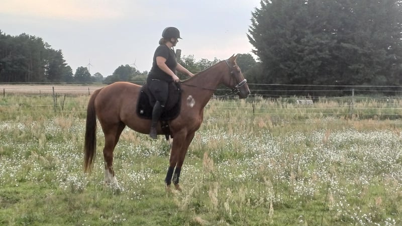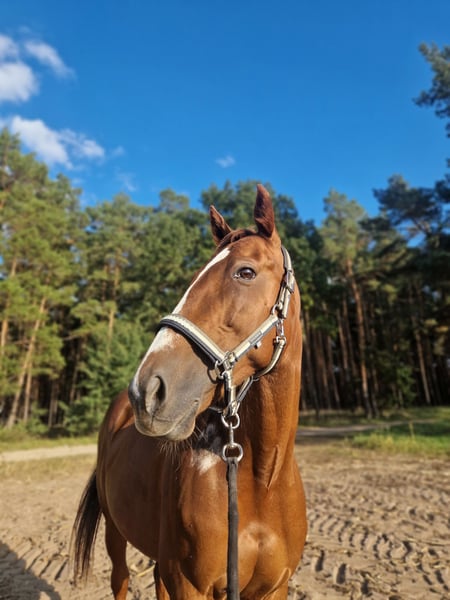 Hallo, suche für meine schöne Traber Stute Hope ein neues Zuhause. Sie ist 8 Jahre alt, 164cm groß und hat einen Charakter aus Gold. Sie ist ranghoch was auch leider der Grund für die Abgabe ist. Da sie mit meiner ersten Stute (halbseitig blind) zu zweit im Paddock steht. Bei der Arbeit braucht sie eine liebevolle, konsequente Hand, zeigt sich aber auch sehr lernbereit, aufgeschlossen und konzentriert. Sie wird aktuell geritten und durch regelmäßige Bodenarbeit und longieren gefördert. Zuletzt hat sie die Freiarbeit kennengelernt (noch nicht so gefestigt). Ich gebe sie als Freizeit- / Familienpferd ab, da sie auch sehr menschenbezogen und verkuschelt ist. Sie ist schmiede-, verladefromm und zeigt sich beim Tierarzt auch brav. Sie ist kerngesund, hat die erste Impfung schon und ist entwurmt. Folgendes Zubehör ist schon im Preis enthalten: - 2x Halfter - 1x Halfter- Kappzaum - 1x Fesselkopfgamaschen - 1x Hufglocken - 1x Regendecke - 1x Outdor-Decke 50g - 1x Fliegendecke - 1x Fliegenmaske - 1x Fliegenhaube Probereiten ist möglich jedoch mit einem Reitpad. Ich bitte nur um ernsthafte Anfragen.