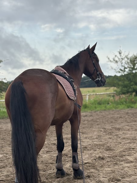 Hallo, ich bin Sherlock. Ich bin ein 7 Jähriger, ca. 1.70 m großer Traber- Wallach, komme ursprünglich aus dem Traber-Rennsport. Seit Januar 2024 bin ich unter dem Sattel und entwickle mich dementsprechend sehr gut. Ich liebe lange schöne Ausritte aber auch anspruchsvolle Aufgaben. Zudem liebe ich Kuscheleinheiten und Bananen. Ich benötige noch viel Sicherheit und Konsequenz und einen erfahrenen, sicheren Reiter. Vorraussetzungen: • muss Erfahrung mit jungen Pferden haben • kein Reitanfänger • viel Abwechslung ins Training einbringen • alle 1-2 Wochen Unterricht nehmen • volljährig sein • darf nicht mehr als 75 Kilogramm wiegen