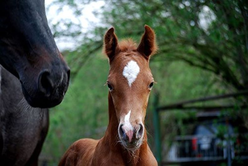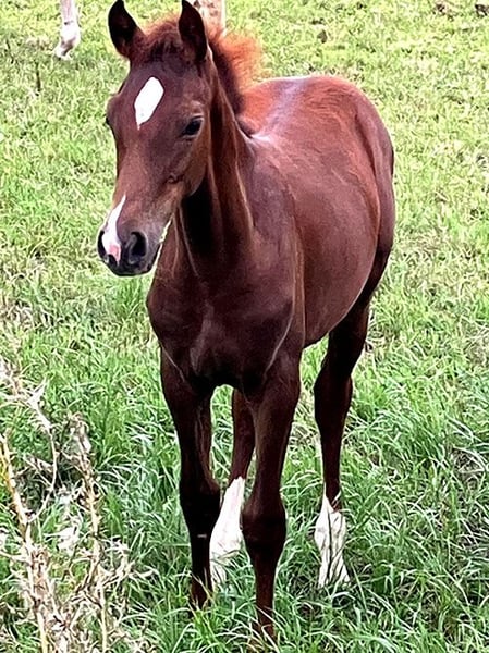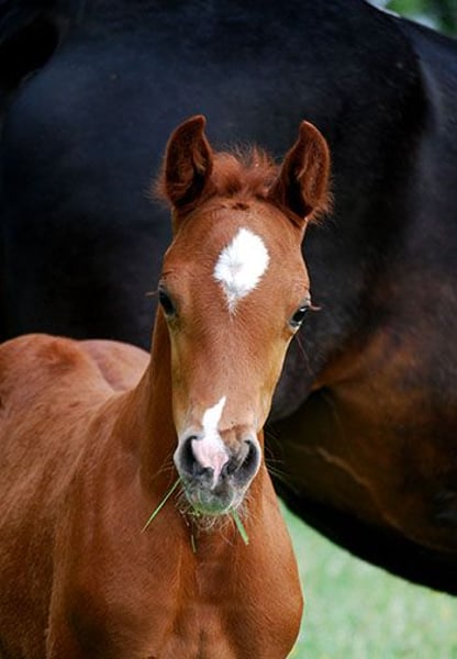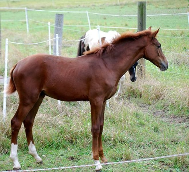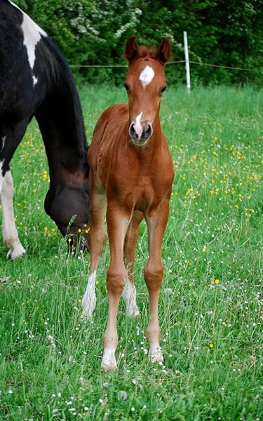 Cello C (geb. 11.04.2025), ein langbeiniges, bildschönes, korrektes, sich auch sehr gut und leichtfüßig bewegendes, pfiffiges Dunkelfuchshengstfohlen (Fohlenprämie!) - Endmaß ca. 169 cm - mit 3 weißen Söckchen und schöner Zeichnung im Gesicht. Sein Vater ist der im Springsport hocherfolgreiche Rapphengst Central Park (Casall x Contender, Station Maas-Hell), der in seinem Pedigree top Springer vereint und mütterlicherseits auf die gekörten Vollbrüder Chello I-III zurückgeht. Mutter dieses Nachwuchskrachers ist unsere typvolle, doppelt veranlagte Prämienstute Sissy C (Samenco K x Camaro, Lehar, Ladykiller xx). Sie brachte mit Ludwig´s As bereits einen bunten Sohn, der sich 5-jährig unter den 20 besten Springpferden in Belgien behaupten konnte und dort begeistert weiter gefördert wird. Cello C ist charakterlich cool und aufgeschlossen, lernt super schnell, zeigt jetzt schon, daß er springen will und kann, wegen seines interessanten Blutanschlusses auch für die Vielseitigkeit und die Zucht interessant. Ein Traumtyp und künftiger Sport- oder Freizeitpartner mit allerbesten Anlagen. Nur in liebevolle, gern fördernde Hände. Mehr Infos auf www.sportschecken.de oder unter 0177/8140272. Absetzen ist ab sofort möglich, derzeit genießt er aber noch seine gemeinsame Zeit mit Mama.