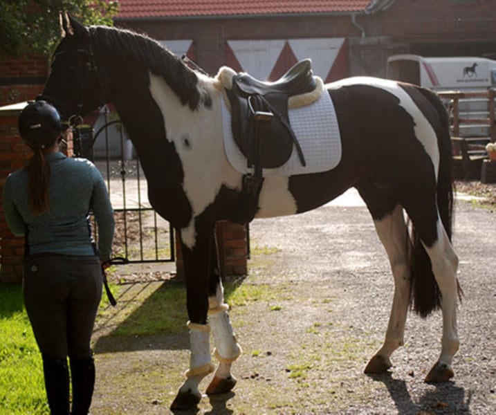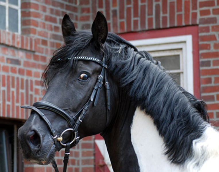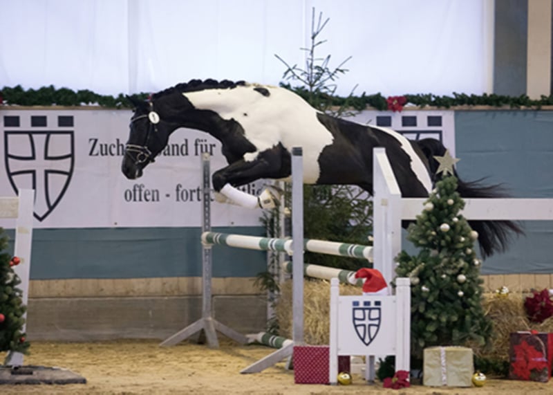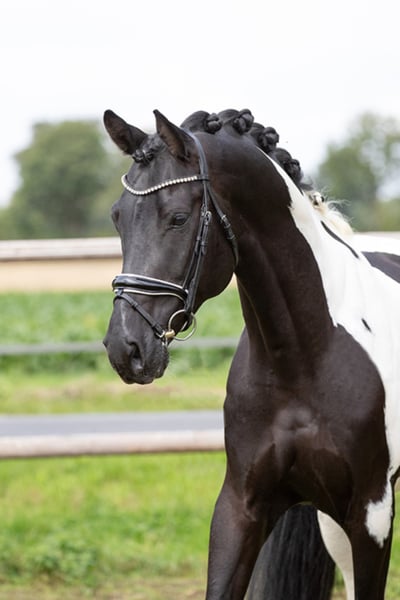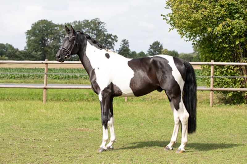 Classic Deluxe - ein bildschöner Bewegungskünstler in seltener Rappscheckfarbe. Gekört und bester ZfdP-Hengst der Körung in Kreuth, leistungsgeprüft auf L-Niveau (50-Tage-Test Dressur), damit lebenslange Deckerlaubnis im Hengstbuch 1! Eine Rarität in punkto Typ, Abstammung, Sportlichkeit und Farbe. Anerkannt für ZfdP (Deutsches Pferd), Oldenburger Verband und DSP (Deutsches Sportpferd), weitere Verbände auf Anfrage. In der Saison 2025 (01.04.2025-31.07.2025) verfügbar über Frisch-/Versandsperma in Deutschland. Decktaxe 950 EUR (für einfarbige Stuten) bzw. zzgl. 550 EUR (sofern aus einer bunten Warmblutstute ein reinerbiges Fohlen fällt). Züchterfreundliches Decktaxensplitting, siehe AGB. Seine Nachkommen können voll überzeugen, bislang alle prämiert, groß liniert mit der genialen Bewegungsmechanik ihres Vaters und ganz viel Typ. Farbvererbung mit einfarbigen Stuten statistisch zu 50%. Wer Farbe liebt, muß heute auf Qualität nicht mehr verzichten. Gern stehen wir Ihnen für Ihre Anpaarungen beratend zur Seite. 0177/8140272. Mehr Informationen zu diesem außergewöhnlichen Sporthengst finden Sie auf www.sportschecken.de Vater Cadeau Noir/Hann. ist inzwischen in der schweren Dressurklasse etabliert, ebenso Muttervater Blickpunkt von Belissimo M x Fidermark. Die Farbe kommt hier über die Mutterseite vom bunten S-Dressur-Sieger EH Samico F, der durch eine Vielzahl von hocherfolgreichen Nachkommen auf sich aufmerksam machte. Großmutter Shakira war zudem 4-jährig Bundessiegerstute des ZfdP. Spitzengenetik in außergewöhnlich schöner Farbgebung. Classic Deluxe wird von Constanze Möller in Ennigerloh dressursportlich gefördert, ist bereits DrPf. L platziert, DrPf. M erste Reserve - zeigt Potential für ganz viel mehr! Nutzen Sie diese Chance!