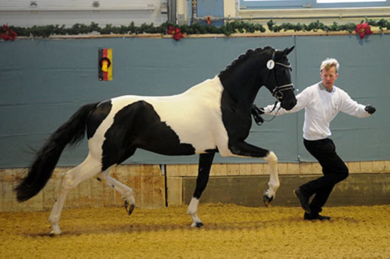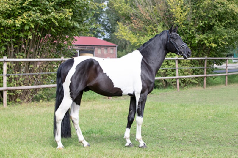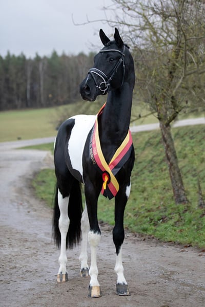 Classic Deluxe - a beautiful movement artist in rare rappscheck color. Licensed and best NDT stallion of the licensing in Kreuth, performance tested at L-level (50-day test dressage), so lifelong stud permission in stallion book 1! A rarity in terms of type, ancestry, sportiness and colour. Recognized for ZfdP (German Horse), Oldenburger Verband and DSP (Deutsches Sportpferd), other associations on request. Available in the 2022 season via Frischsperma (www.gestuet-lichtenmoor.de) in Germany or native inseminations on this station. Breeder-friendly cover tax splitting, see terms and conditions. With a very manageable stud use, he delivered a fullminant 1st foal vintage, all large lined with the ingenious movement mechanics of their father and a lot of type, all awarded. Color inheritance with monochrome mares statistically to 50%. Anyone who loves colour no longer has to do without quality. We are happy to advise you on your pairings. 0177/8140272. More information about this extraordinary sports stallion can be found on www.sportschecken.de Father Cadeau Noir/Hann. is now established in the heavy dressage class, as is mother father Blickpunkt of Belissimo M x Fidermark. The color comes here over the mother side of the colorful S-dressage winner EH Samico F, who attracted attention through a variety of highly successful offspring. Grandmother Shakira was also a 4-year-old national winner mare of the ZfdP. Top genetics in exceptionally beautiful coloring. Take advantage of this opportunity!