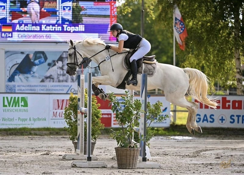 Celebration 62 – leistungsbereite Springstute mit Vermögen und Charakter Zum Verkauf steht unsere 13-jährige Stute Celebration 62, abstammend aus leistungsstarker Springgenetik (Cashmaker x Kolibri). Diese Stute überzeugt durch sehr viel Vermögen, Kraft und eine ausgeprägte Leistungsbereitschaft. Sie bringt alles mit, was man sich von einem sportlich veranlagten Springpferd wünscht: eine aktive Hinterhand, viel Energie und eine klare Einstellung zur Arbeit. Im täglichen Umgang zeigt sie sich wach, aufmerksam und selbstbewusst. Unter dem Sattel ist sie eher nach vorne orientiert und möchte entsprechend klar und konsequent geritten werden. Sie ist kein „Selbstläufer“, sondern ein Pferd für Reiter, die Freude daran haben, mit einem motivierten und sensiblen Partner zu arbeiten. Bei passender Förderung zeigt sie sich engagiert, lernwillig und mit viel Qualität am Sprung. Besonders Reiter mit etwas Erfahrung finden in ihr ein Pferd mit Perspektive und Entwicklungspotenzial. 13 Jahre ca. 1,62–1,63 m Stute, Schimmel leistungsstarke Abstammung (Cashmaker x Kolibri) viel Vermögen und Go für ambitionierte Reiter geeignet Sie eignet sich besonders für: ✔ ambitionierte Jugendliche oder Erwachsene mit Unterstützung ✔ Reiter mit klarer, ruhiger Reitweise ✔ sportlich orientierte Freizeit- oder Turnierreiter Nicht geeignet ist sie für reine Anfänger oder unsichere Reiter. Eine ehrliche, charakterstarke Stute mit viel Qualität, die bei passendem Reiter viel Freude und Entwicklung bietet.