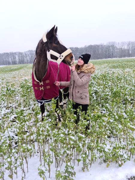 Con gran pesar, buscamos un nuevo hogar adecuado para nuestra yegua nacida en 2011. Tiene una estatura agradable de aproximadamente 1,70 m. Es hija de Lissaro x Laudabilis, por lo que posee una excelente línea de sangre orientada al adiestramiento. En cuanto a carácter, es una verdadera joya: muy amigable, muy tranquila y cautelosa. También es fácil de manejar para niños y jinetes más jóvenes. Destaca principalmente por su carácter excepcionalmente amable y equilibrado: - Muy cercana a las personas - Absolutamente tranquila y cautelosa en su trato - Amigable con los niños y fácil de manejar para jinetes jóvenes - Relajada, amistosa y con una mente clara Debido a una lesión en el tendón en la parte frontal derecha (que ya está curada), la vendemos como un caballo de ocio exclusivamente para la doma. Además, es coprina, lo cual solo se nota cuando come y tiene la posibilidad de colocarla. Nunca hemos tenido problemas con su copra, como cólicos o que nuestros caballos en el establo hayan aprendido algo de ella. La vendemos solo a las mejores manos — preferimos calidad sobre cantidad.