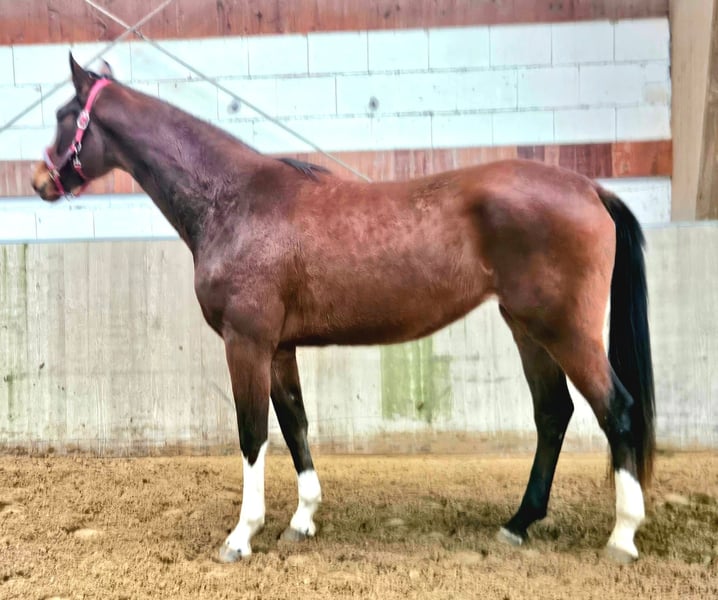 Excelente oportunidad de un caballo criado con amor por un pequeño criador privado. Ofrecemos una yegua de 3 años, de color marrón, nacida en 2023, que aún se encuentra en desarrollo. A su edad, todavía está en proceso de crecimiento y desarrollo. Actualmente mide aproximadamente 1,70 m y destaca por sus buenos movimientos básicos y su impulsión. Es valiente y actualmente se está acostumbrando a todo, como la brida, la cuerda, las protectores, y los conceptos básicos, mostrando siempre disposición para aprender y ser fácil de manejar. Ideal para un jinete que desee criar y entrenar a un caballo joven según sus propias ideas. Pedigrí: Diamantenglanz x All at once Certificado de salud actual sin hallazgos relevantes disponible. Para más información y una visita, no dudes en contactarme al 016096034263.