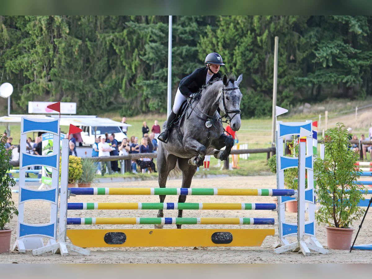 For sale is a talented grey mare, born in 2018, with an approximate height of 17.1 hh. She impresses with her gentle and straightforward temperament – both in daily handling and under saddle. No vices, always well-behaved and reliable. Despite her size, she still needs some time to fully develop her physique. However, she already demonstrates great potential in sport: numerous placings and wins in show jumping competitions at the A and L levels speak for themselves. Her ability clearly exceeds these achievements – she has plenty of scope in the jump-off, is ambitious, and absolutely dependable; she does not refuse or stop. At home, she also handles cross-country terrain confidently, whether alone or in a group. An ideal partner for ambitious riders seeking a talented and honest horse for show jumping.