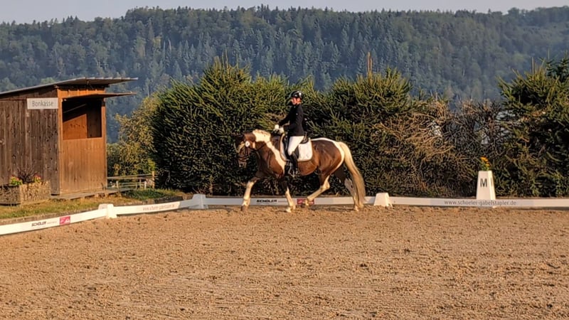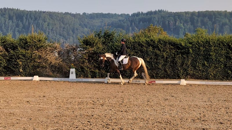 Deutsches Reitpferd – Vielseitige Scheckenstute Einen Bestplatz bei einer/m liebevollen, kompetenten Reiter/in suche ich für meine selbstgezogene, absolut liebenswerte und leistungsbereite Stute Duke's Coloured Symphony, (Roxy) 9j., ca. 1,64m , abstammend von Duke of Hearts xx, eingetragen als Deutsches Reitpferd. Roxy überzeugt zunächst optisch durch ihre auffällige, gleichmäßige Scheckung, 4x hoch weiß gestiefelt und ihr freundliches Wesen. Sie ist gut und vor allem reel ausgebildet und zeigt sich sehr vielversprechend in der Vielseitigkeit und Dressur. Ihr ausgeglichenes Temperament macht sie sowohl für erfahrene Reiter als auch für ambitionierte Ponyumsteiger interessant, allerdings möchte ich sie nur in erfahrene Hände (ab A Niveau) wissen, daher nicht als Kinderreitpferd. Die Stute ist ein Schatz im Umgang, immer händelbar und hat bereits Erfahrung auf allen Bühnen gesammelt. Ob Ausreiten, in der Gruppe, mit und ohne Handpferd, Zirzensik, Bodenarbeit, Doppellonge, etc. Diese Saison wurde sie behutsam an den Turniersport herangeführt und sie überraschte uns als Schleifensammlerin mit ihrer unglaublichen Souveränität, Gelassenheit und ihrem Leistungswillen. Alle 5 Geländeprüfungen konnte sie mit hervorragenden Noten von 8,0-8,6 für sich entscheiden und ist nun bereit, nach einer guten Winterarbeit, die kommende Saison in der VA durchzustarten! Auch im Springen und A Dressuren wurde sie bis 8,0 belohnt. Beim Springen hat sie noch nie verweigert, will immer, egal ob Wasser, Graben, Trakenergraben, bunt oder flatternd. Sie hat das Herz und die unvergleichliche Einstellungen ihrer Mutter Campari geerbt und die sportliche Konstitution ihres Vaters, dem erfolgreichen Buschpferdevererbers, DUKE OF HEARTS XX. Sie ist die einzige Scheck-Nachzucht dieses Spitzenvererbers. Sie ist gesund, regelmäßig geimpft, entwurmt und schmiede- und Verladefromm. Roxy liegt mir sehr am Herzen und ich möchte sie an einen Bestplatz aufgehoben wissen. Dabei ist mir sehr wichtig, dass sie genauso reel und fair weiter gefördert wird. Mit Spaß, Freude und Fairness gegenüber diesem wundervollen Pferd. Auch ein zur Verfügung Stellen eines ambitionierten Reiters ab L Niveau im Umkreis von 200km von Freiburg ist interessant für mich!