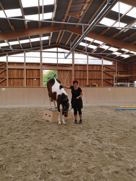 Caballo de monta alemán – Yegua pintada versátil Se vende una hermosa yegua pintada llamada Roxy (Duke's Coloured Symphony), nacida en 2016. Con una altura de 164 cm, es la compañera ideal para actividades de monta versátiles y es adecuada tanto para el ocio como para el deporte de competición. Roxy impresiona primero por su llamativa coloración y su carácter amigable. Está bien y, sobre todo, correctamente entrenada y se muestra muy prometedora en la versatilidad y la doma. Su temperamento equilibrado la hace interesante tanto para jinetes experimentados como para ambiciosos principiantes. La yegua es muy tranquila en el manejo, siempre es manejable y ya ha acumulado experiencia en todos los niveles. Esta temporada ha sido introducida al deporte de competición y nos ha sorprendido con su increíble seguridad, calma y voluntad de rendimiento. En las 5 pruebas de campo ha logrado excelentes calificaciones de 8.0 a 8.6 y ahora está lista para comenzar la próxima temporada en la VA. También en salto y doma ha sido recompensada con hasta 8.0. Nunca ha rehusado en el salto, siempre quiere, ya sea en agua, zanjas, trakehner, colorido o ondeante. Ha heredado el corazón y la incomparable actitud de su madre Campari y la constitución atlética de su padre, el exitoso semental de salto, DUKE OF HEARTS XX. Es la única cría pintada de este semental de élite. Está sana, vacunada regularmente, desparacitada y es tranquila para el herrado y el transporte. Roxy me importa mucho y quiero que sea cuidada en un buen lugar. Es muy importante para mí que continúe siendo promovida de manera correcta y justa, con diversión, alegría y equidad hacia este maravilloso caballo.