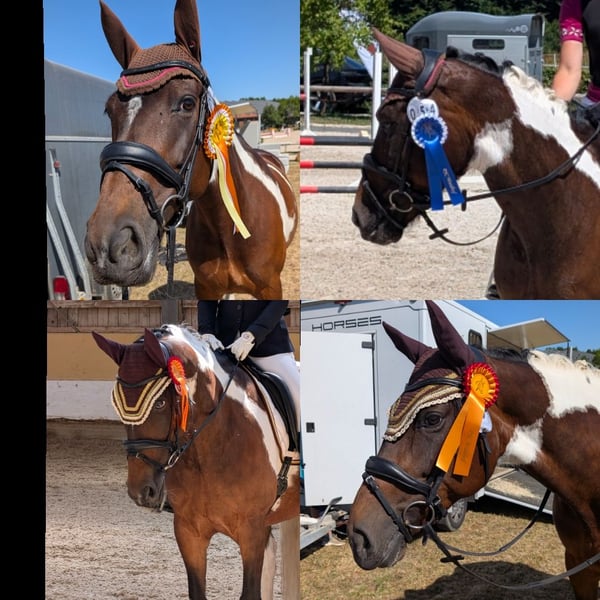 Cheval de dressage allemand – Jument pie noire polyvalente Je recherche une cavalière ou un cavalier aimant et compétent pour offrir la meilleure place à ma jument, Duke's Coloured Symphony (Roxy), une fille née en 2014, environ 1,64 m, issue de Duke of Hearts xx, enregistrée comme cheval de dressage allemand. Roxy séduit d’abord par son apparence remarquable, avec sa robe pie noire régulière, ses quatre membres bien haut blancs et sa nature amicale. Elle est bien et surtout solidement dressée, et montre beaucoup de potentiel en concours complet et en dressage. Son tempérament équilibré la rend intéressante aussi bien pour des cavaliers expérimentés que pour des jeunes cavaliers ambitieux, mais je souhaite qu’elle reste sous la responsabilité de personnes expérimentées (niveau A et plus), elle n’est donc pas adaptée pour des enfants. La jument est une véritable perle en matière de comportement, toujours facile à manipuler, et elle a déjà acquis de l’expérience sur tous les terrains. Que ce soit en balade, en groupe, avec ou sans guide, en cirque équestre, en travail à pied, en double longe, etc. Cette saison, elle a été doucement introduite au sport de concours et elle nous a surpris par sa sérénité, sa calme et sa volonté de performer. Elle a remporté cinq épreuves de cross avec d’excellentes notes allant de 8,0 à 8,6, et elle est prête, après un bon hiver de travail, à débuter la saison en compétition officielle ! Elle a également été récompensée jusqu’à 8,0 en saut d’obstacles et en dressage A. En saut, elle n’a jamais refusé, elle veut toujours sauter, que ce soit dans l’eau, un fossé, un fossé de trakener, coloré ou flottant. Elle a hérité du cœur et de l’attitude incomparable de sa mère, Campari, ainsi que de la constitution sportive de son père, le célèbre reproducteur de chevaux de bush, DUKE OF HEARTS XX. Elle est la seule descendante pie de ce reproducteur de haut niveau. Elle est en bonne santé, régulièrement vaccinée, vermifugée, et habituée à la ferrure et au chargement. Roxy me tient énormément à cœur et je souhaite qu’elle trouve la meilleure place possible. Il est très important pour moi qu’elle continue à être développée de manière réaliste et équitable, avec plaisir, joie et respect envers cette merveilleuse jument. Je suis également intéressé par la mise à disposition d’un cavalier ambitieux à partir du niveau L, dans un rayon de 200 km autour de Fribourg !