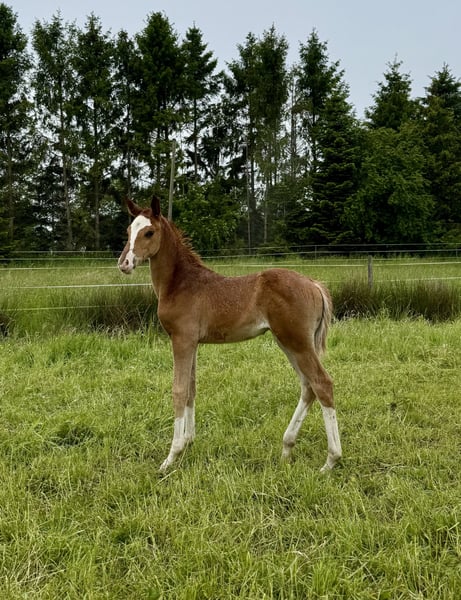 Colorful, eye-catching filly Versatile breeding, still looking for her favorite person Expected height at maturity 1.64 - 1.68m Pedigree: Alle Fraben x Arcachon NRW x Farewell x Florestan From the Nizza line (Be my Dancer / Beckmann) Location: Northern Germany