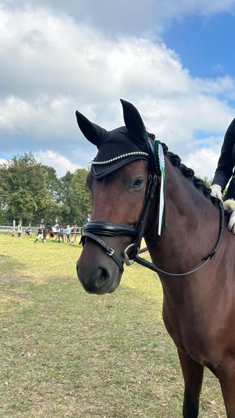 Te koop staat onze dressuurponyhengst Dante, vanwege de overstap naar een groot paard. Oorspronkelijk gefokt als dressuurpony, geniet hij toch ook van een paar kleine sprongen voor de afwisseling. Door zijn nobele, slanke uitstraling is hij geen gewichtsträger. Dante gaat zowel solo als in een groepje het terrein in en heeft al succesvolle wedstrijdervaring opgedaan. Ook in vreemde hallen en op onbekende terreinen laat hij zich probleemloos rijden. Hij is laads- en hoefsmidvriendelijk, vriendelijk in de omgang en zeer aan zijn mens gehecht. Dante wil eerlijk en fijn bereden worden. Onder het zadel kan hij af en toe wat milieugericht zijn, maar nooit kwaad. Het pony is geen puur kinderpony; een moeder-dochter duo kunnen wij ons goed voorstellen. Dante is regelmatig gevaccineerd, zijn tanden worden jaarlijks gecontroleerd en osteopathie is hem bekend. Hij beschikt over een op hem afgestemde dressuurbodem (16,5 inch), die hij graag mee zou nemen naar zijn nieuwe thuis, indien mogelijk. Bij verdere vragen sta ik graag tot uw beschikking.