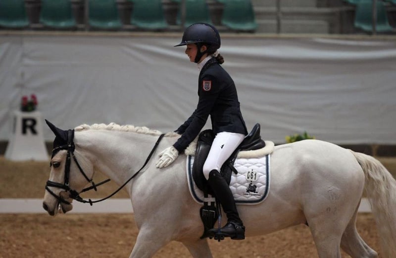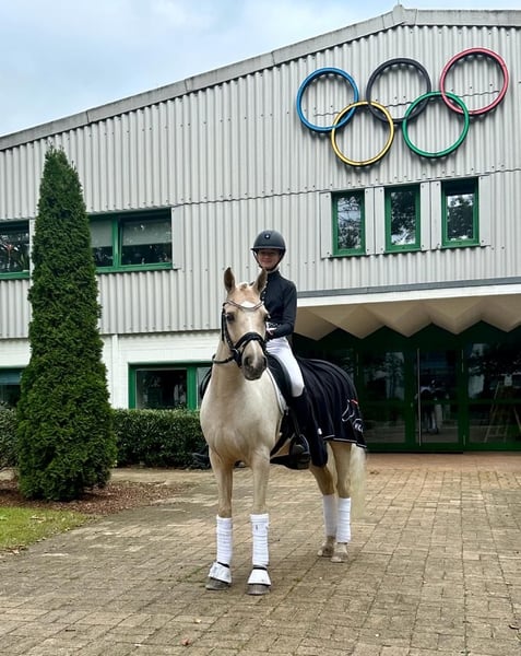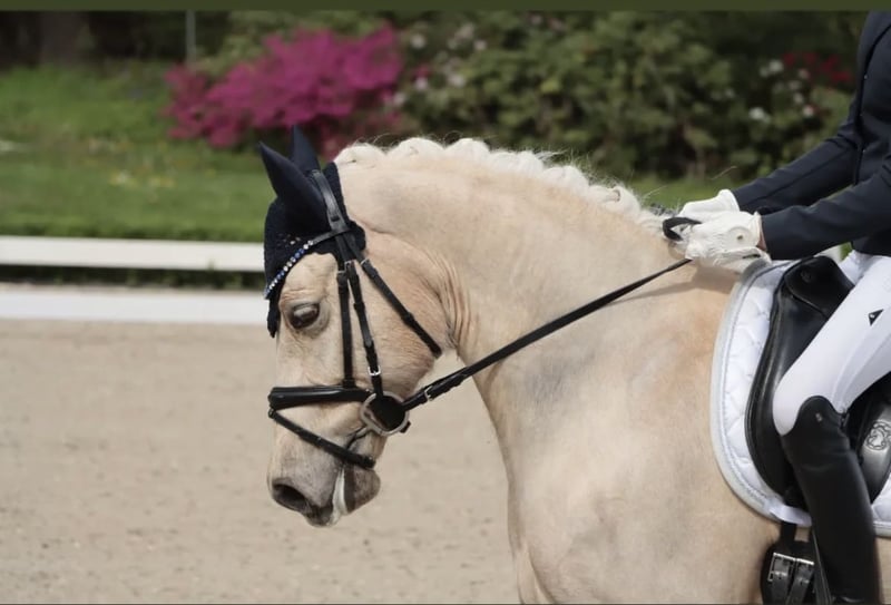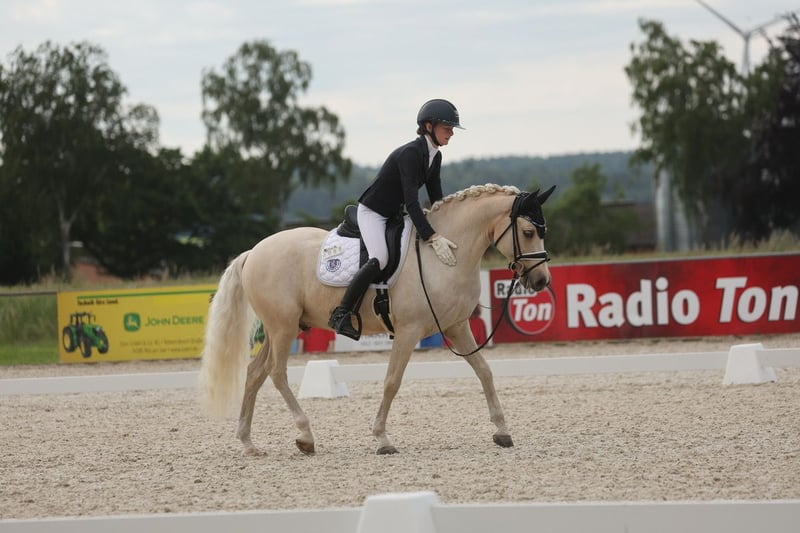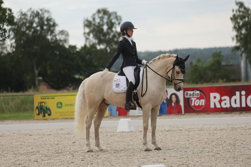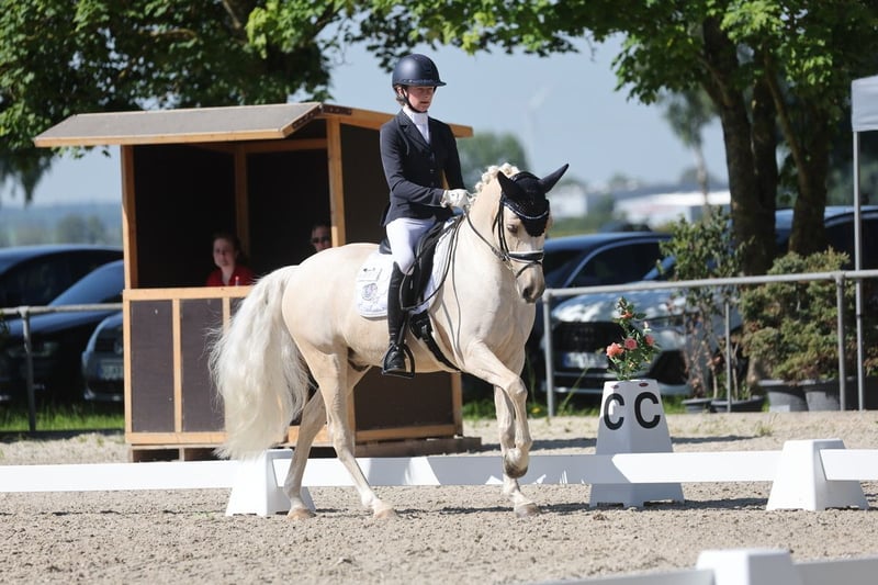 Glitzerflitzer is a reliable and calm pony that always provides a sense of security for its rider. Especially in walk and canter, he impresses with excellent quality, rhythm, and a comfortable seat. He has competed in several pony FEI classes, achieving placings of up to 69.**%, consistently demonstrating composure, nerves of steel, and motivation. In national competitions, Glitzi has won multiple L-level dressage tests, with scores up to 8.5. He has also competed several times at the South German Pony Championships and the Hessian Championships. He is very well-behaved in handling, clear-headed, and remains calm in new situations, whether at competitions, during training, or in everyday life. Glitzi always wants to please his rider and works with motivation. He provides his rider with a lot of confidence and is ideally suited for an ambitious young rider who wishes to continue competing in the sport.