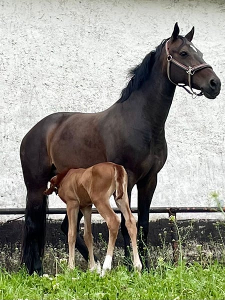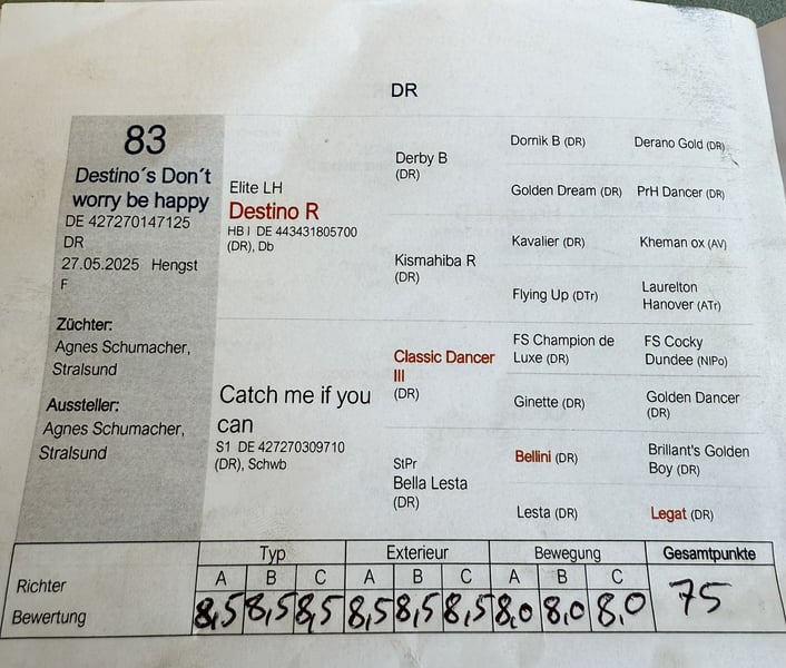 Destino's Don't Worry Be Happy, short for Happy This beautiful, charming, strong-minded, and curious young man in a dark chestnut coat will be ready to move to his new owners in December and charm them completely. He is absolutely people-oriented and knows everything a little pony should know. On July 19, 2025, we were in Groß Viegeln with him, where he was awarded as an Elite Foal. Videos available upon request. Born on May 27, 2025 Pedigree: Sire: Elite Stallion Destino R Dam's Sire: Classic Dancer III For further pedigree details, please refer to the image. If you have any further questions, feel free to write.
