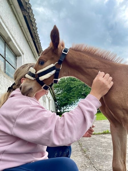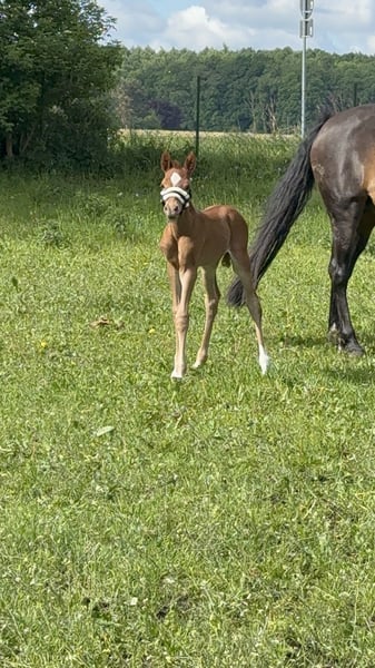 Destino‘s Don‘t worry be Happy, kurz um Happy Dieser wunderschöne, charmante, nervenstarke und Neugierde junge Mann in dunklere Fuchsjacke darf ab Dezember ausziehen und seine neuen Besitzer um den Finger wickeln. Er ist absolut Menschen bezogen und kennt alles was ein kleiner Ponymann kennen sollte. Am 19.07.25 waren wir mit ihm in Groß Viegeln, wo er als Elite Fohlen prämiert wurde. Video gerne auf Anfrage. Geboren am 27.05.2025 Abstammung: V.: Elitehengst Destino R MV.: Classic Dancer lll Weitere Abstammung, bitte den Bild entnehmen. Bei weiteren Fragen gerne schreiben