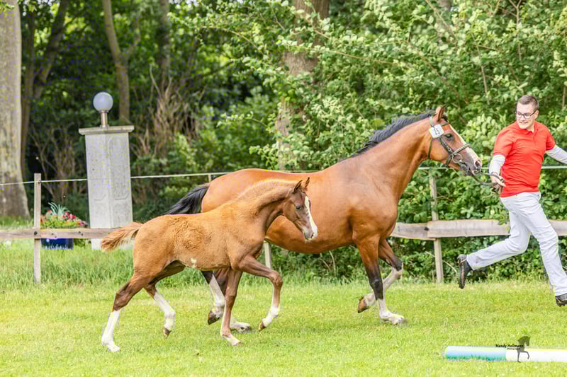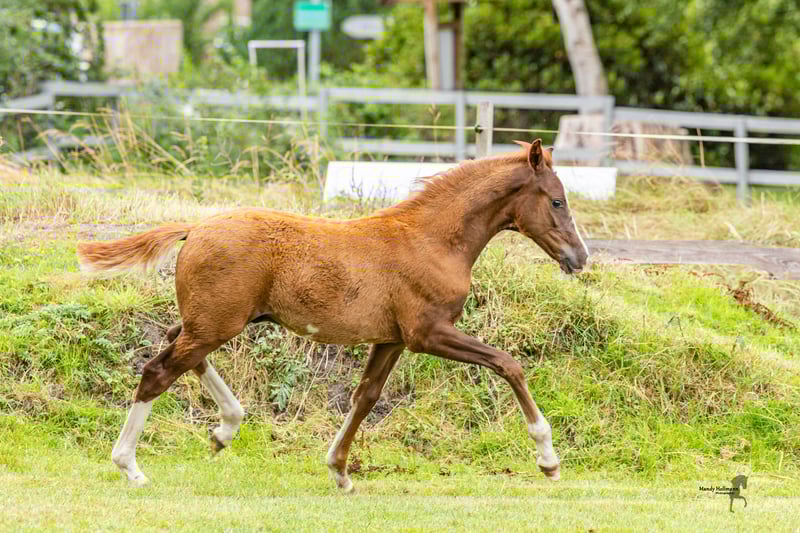 **Sales Advertisement: German Riding Pony Stallion** For sale is a promising German Riding Pony stallion, born in 2025. With an estimated final height of 148 cm and his striking chestnut color, he attracts all attention. This talented stallion is well-suited for dressage. He has harmonious movement and a pleasant temperament, making him an ideal partner for ambitious riders. He is well-mannered, easy to handle, and has a friendly disposition. Whether for leisure or competition, this stallion offers many opportunities and will surely bring a lot of joy. If you are interested or have any further questions, please feel free to contact me. Viewings can be arranged by appointment. Don't miss this chance!