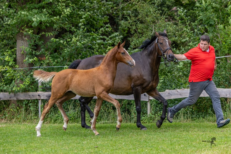 For sale is a promising German Riding Pony stallion, born in 2025. With his attractive chestnut coat and an estimated final height of 150 cm, he is not only a real eye-catcher but also a talented partner for dressage. This stallion impresses with his quality of movement and pleasant temperament. He is well-mannered and already shows promising approaches in his training. He is well-socialized and familiar with other horses. The last pictures show the father, Neuseriem Deichkieker WE. If you are interested or have any further questions, please feel free to contact me. We look forward to your message!