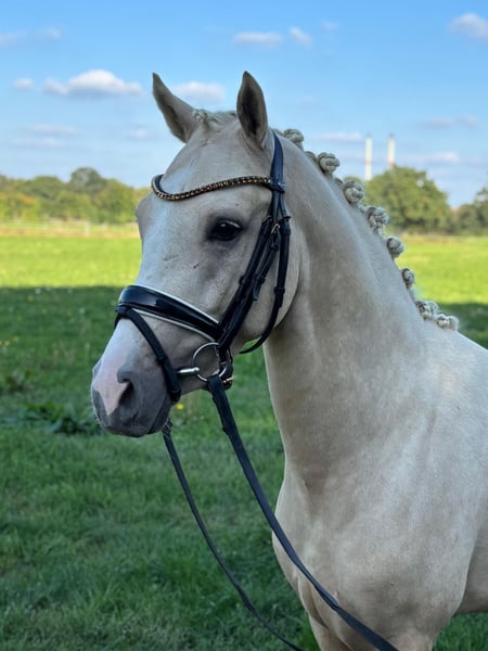Venustas Cool and Easy Hübscher und bewegungsstarker Dressurpony Hengst von Cool Edition x Golden Dancer x Domino Dancing geb.01.01.2023, Stockmaß z.Zt. ca. 146cm, Fuchsisabell (Palomino) korrekt im Fundament und artig im Umgang. Er wurde bereits longiert und zeigt dabei stets seine Arbeitsbereitschaft. Aufgrund seines Alters (geb. Januar 2023) kann er zeitnah angeritten werden. Ein TÜV ohne Befund liegt vor. Cool and Easy entstammt einer bedeutenden Mutterlinie. Seine Großmutter Dimona B ist rechte Schwester der Hengste Dornik B und Going East. Dorik B ist der erfolgreichste Hengst der deutschen Ponyzucht. Wir möchten diesen hoffnungsvollen Junghengst sehr gerne in fördernde Hände abgeben. Auf Wunsch kann er bei uns kastriert werden. Ein kurzes Video ist vorhanden.