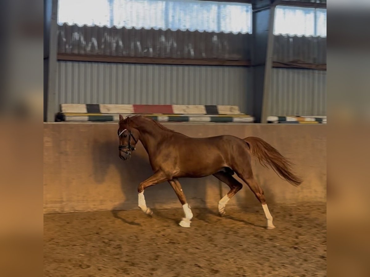 Our pony treasure chest is opening again: Here is a talented young horse with great potential... The stunning chestnut with four white legs is a real eye-catcher. But let him introduce himself to you: Hello, my nickname is "Hans im Glück" (Hans in Luck)... 🍀🍀❤️🍀🍀 Why? My mom, Sjouke, probably sensed I would be her last foal (she is now retired), because she absolutely didn’t want to part with me – and I felt completely at home in her belly. 🥰 My breeder checked on my mom that evening (we were already four weeks overdue...) and inspected the foal’s belly strap from the foal alert. Then she quickly said goodbye to Kiana and her mom, just a few steps from our box in the parking lot. I took the opportunity 😊 and slipped out of the belly into the new world! 🫶 The “old” breeder was quite surprised – less than 10 minutes had passed – and she joyfully called out: “Welcome, little Hans im Glück!” Of course, she recognized I was a colt 😉😃💪, so that’s how I got my name 😅. I grew up at Buchenhof Stud – lovingly cared for by my mom and later in the stallion group with our stand-in dad, Leo, on the Weser in the marshlands. We stayed together even in youth... 🐴 And now, even though we each have our own straw bed and have already learned a lot from our trainer Lennard Heise, we are still close. 🫶 I love cuddling with my buddies – we are very affectionate and like to give kisses. 💕 And I always look forward to “work” time. Lennard says I’m a little overachiever. My trot 🥇 is amazing! My walk and canter also suggest a promising future in dressage. 😇 The path is clear: my mom is an FEI pony, and my dad is even a winner in international FEI competitions – he was, among others, the champion in the dressage championship in Spain (Spanish champion). That’s exactly how I envision my career! 💪🫶 So, if you want me to be part of your family with sporting ambitions, get in touch – I’m excited! 💕 I am now 146 cm tall and can already do circles on the longe line with a saddle, and starting next week, I’ll begin riding. 💪🫶 Oh, and my pedigree: Premium stallion Harry Potter x Sjouke by Elegant Location – Buchenhof Stud, Achim near Bremen And I am a quite dark chestnut with four white legs and the most beautiful eyes – so dark and loyal, I love to look at you with them. 🥰🫶