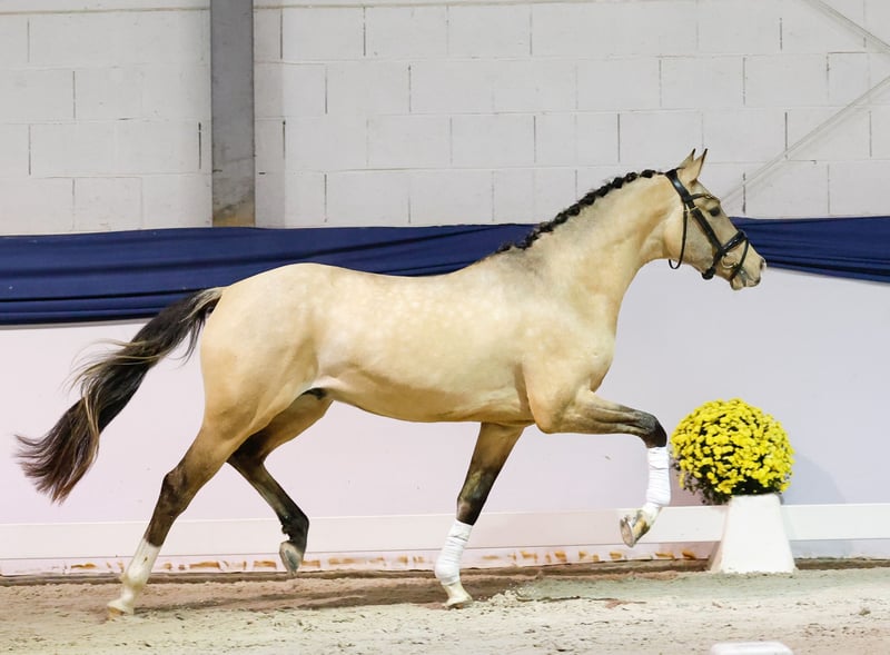 In unserer Kollektion stehen streng selektierte Youngster f�r alle Anspr�che: Ausbildungs-, Zucht- und Kinderponys Hier gelangen Sie zur Gesamtkollektion: https://ponyforum.auction Ein gekörter XL-Hengst aus dem 1. Jahrgang des viel besprochenen Gold Garants bereichert unser Auktionslot! Der typ- und bewegungsstarke Zöthens Goldstern begeisterte mit seiner hohen Grundqualität und Präsenz schon die Körkommission in Prussendorf und erhielt ein positives Körurteil. Mit seinen langen Linien und der großen Aufmachung wird Goldstern zukünftig das perfekte Damenreitpferd sein, ein gang- und typstarkes XL-Pony als absoluter Eyecatcher im Stall. Bestes Dressurblut fließt übrigens auch durch den Mutterstamm in seinen Adern, so steht hier u.a. der Erfolgsvererber Belissimo M, der besonders durch seinen Sohn Benicio neue Maßstäbe in der Dressurpferdezucht setzen konnte. Goldstern ist schon sehr gut longiert und er kennt - und liebt - das Freispringen.