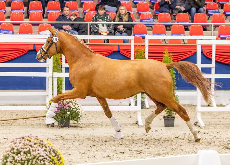 For Sale: German Riding Pony Stallion – Chestnut, born 2023 We are offering a beautiful, licensed German Riding Pony stallion born in 2023, from a performance-oriented mare line. With his striking appearance, he is sure to turn heads. The pony stands approximately 150 cm (14.3 hh) and is ideally suited for dressage. He impresses with his friendly nature, eagerness to learn, and pleasant temperament. The young stallion is very well-mannered and shows great potential for dressage. Videos from his licensing are available on ClipMyHorse. Please feel free to contact me for more information or if you are interested. Arrange a viewing to meet this promising pony in person!