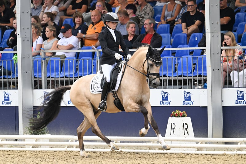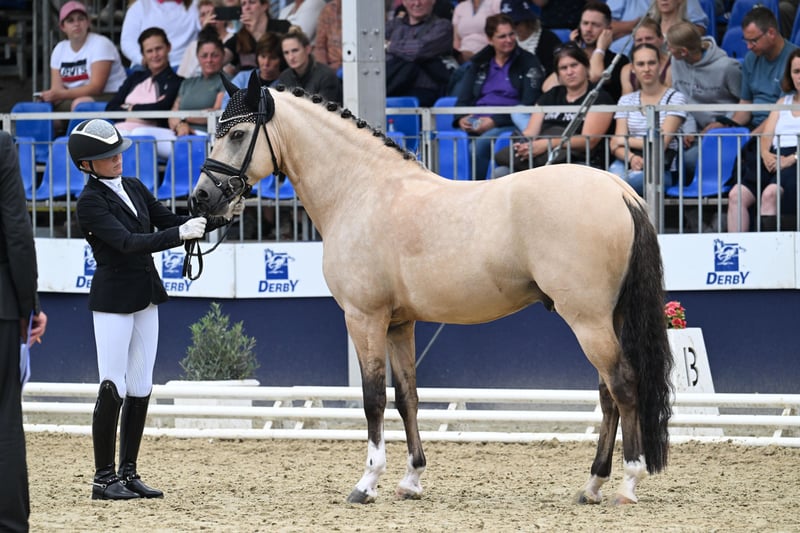 This very special pony combines everything that riders' hearts dream of. Featuring a striking, custom coat color in Dunskin, it not only captures attention visually but also impresses with its inner and outer qualities. Its strong hereditary traits, combined with good conformation, correctness, and outstanding movement quality, make it a true exceptional representative of its breed. Athletically, this pony leaves nothing to be desired: First reserve champion, multiple series winner in riding horse competitions up to dressage horse L-level – confidently competing against warmbloods as well. It always presents itself as motivated, focused, and performance-ready, without ever appearing nervous or overwhelmed. A true lesson pony that provides confidence to its rider and makes learning easy. But it’s not only in the arena where it impresses: It’s also an absolute dream in the countryside. Whether alone or in a group – it knows both situations, remains calm, is not spooky, and is reliable at all times. A pony you can trust and depend on 100%. This combination of willingness to perform and nerve strength makes it so special. Standing at its perfect final height, now 6 years old, measuring 14.8 hh (with shoes), it has ideal prerequisites for high-level pony sport. It is now ready for its first FEI tasks – with the right child by its side. And it’s incredibly versatile: Whether for less experienced riders who need safety and routine, or ambitious, already experienced children aiming to progress in sport – this pony handles every situation confidently, delicately, and always in harmonious partnership with its rider. Always honest, always diligent, always joyful in work. A true partner for children – both in sport and in everyday life. Impeccable X-rays from 2022 are available! Serious inquiries only – riding tourism is not permitted!