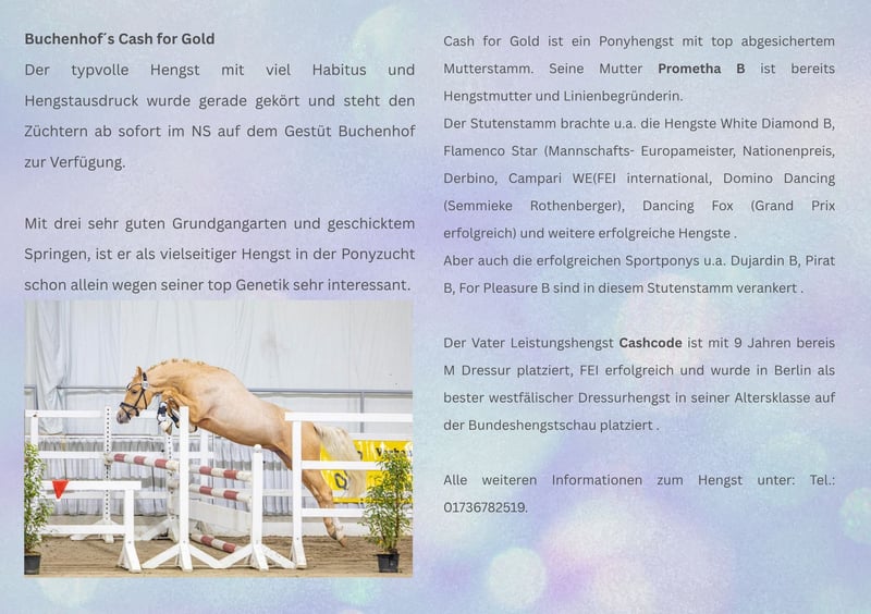 Unser Gestüt liegt inmitten der wunderschönen Wesermarsch, in Achim bei Bremen.Unsere Pferde und Ponys wachsen in traumhafter Umgebung auf riesigen Weiden ,direkt am Wasser auf.Bei uns werden die Fohlen in schönen Boxen geboren, erleben eine Top Aufzucht, mit sehr gutem Mineralfutter und viel Weidegang. Bewegung ist für uns absolut wichtig auch im Winter.Das Fohlen ABC,die Remote- Ausbildung und weitere Schulung bis zur Turniervorstellung und Starts bis zur höchsten Klasse sind unser Anspruch. Wir legen grossen Wert auf Qualität-dies nun schon seit über 30 Jahren. Alle Pferde haben Familienanschluss und das merkt man Ihnen auch an.Mit viel Freude züchten wir Ponys und Pferde im Schwerpunkt Dressur.Auch eigene Hengste gehören zum Gestüt....so können wir Vater und Mutter mit Nachzucht den interessierten Kunden zeigen.Nur wenige Minuten vom Autobahnkreuz Bremen zu uns auf das Gestüt -Flughafen-Transfer möglich. Auf Wunsch können Übernachtungenauf dem Gestüt gebucht werden-so kann in aller Ruhe das Herzenspferd in Augenschein genommen werden.
