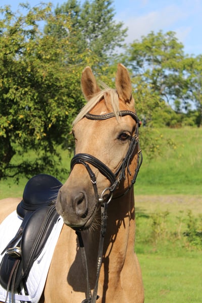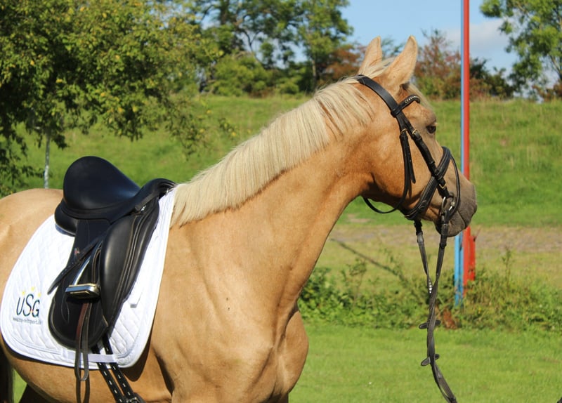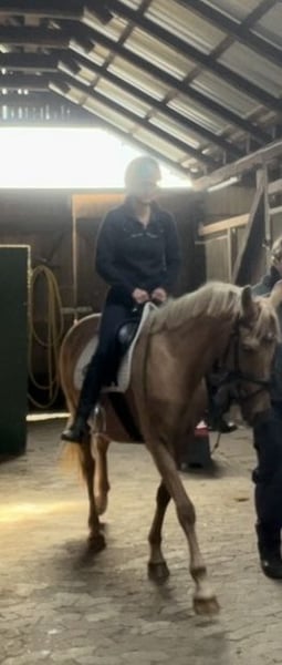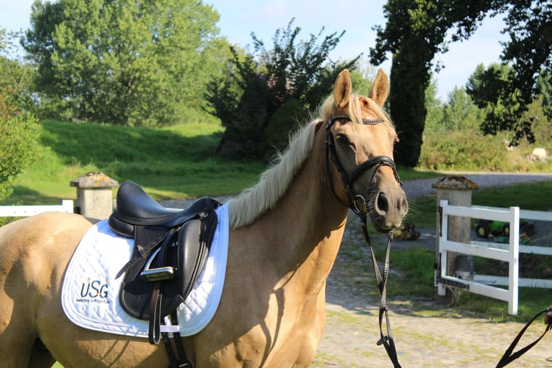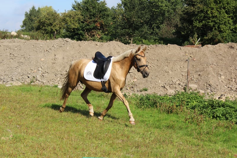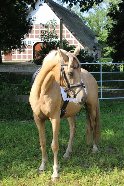 For sale is a beautiful, extremely people-oriented Palomino mare (German Riding Pony), 10 years old, with a height of 1.45 m (measured, but has good coverage due to her ample frame). She comes from a renowned breeder and has an excellent pedigree (by Donatelli-Dornik B out of a Casino Royale dam). As a premium mare, she has already proven her quality and has produced two very successful offspring – one daughter is also awarded, and another foal is 1 year old. Due to her outstanding bloodline, pleasant temperament, and breeding performance, she is ideally suited for further breeding, but with appropriate training, she is also an exciting option as a riding pony. ✅ Character & Handling • Low in rank, absolutely herd-compatible, and very affectionate with children • Good with the farrier and loading • Very people-oriented, friendly, and uncomplicated in daily handling ✅ Training & Development The mare came to me from poor conditions, was nursed back to health and dewormed. We are currently starting with lunging work and further acclimatization to saddle and bridle – which she accepts bravely and eagerly. Her background is not entirely clear regarding whether she has been under saddle before. ✅ Gait She possesses three appealing basic gaits, with the trot particularly standing out due to her active hind leg. Price: €5,000 fixed price – no installment payments. A great pony for breeding enthusiasts, but also an exciting project for riders who enjoy further developing and training a pony. Location: 21712 Videos available upon request with full name provided. TEL: 0170 58 53 098