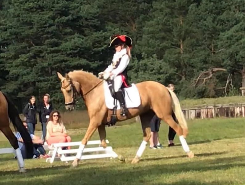 With a heavy heart, we are offering our pony princess for sale. She is a German Riding Pony mare – Palomino, born in 2011, and was bred from the stallion Don’t Worry and Arts-Dancer Boy. Not only is she a real eye-catcher in appearance, but despite her height of 146 cm, she covers very well in the stallion type, and we are often asked if she still meets the size requirements. Our Mary is a true prize winner, an excellent teacher, and a reliable partner in all aspects of life. She loads independently onto trailers and transporters, and she comfortably stands for the farrier and clipping. She knows how to present herself confidently at competitions. She has achieved success at L* level, mostly against larger horses, and has been placed high in L** classes – there is certainly potential for further development here. She is a secure L** level lesson horse and is easy to handle even for smaller, less experienced riders. She has been district champion and winner of the Volksbank Cup, among other accomplishments. Mary has a very sweet nature and truly is a princess. She is open to almost any kind of fun, loves swimming, enjoys hacks, and likes jumping – although we have not actively promoted her in this discipline. As a member of the Lower Saxony Pony Quadrille, she has participated confidently in several major events, including the CHIO Aachen opening ceremony (on the famous grass arena), the Hamburg Derby, the Horse & Hunt, and many others. She has never been ill with us and has never been in a bad mood. We are not in a hurry to sell her and will only part with her if we find a truly wonderful princess home for her. If you are genuinely interested, please contact us via WhatsApp at 016097233628.