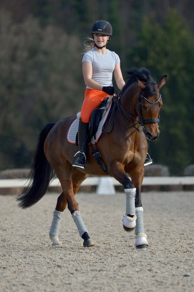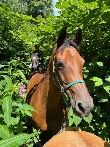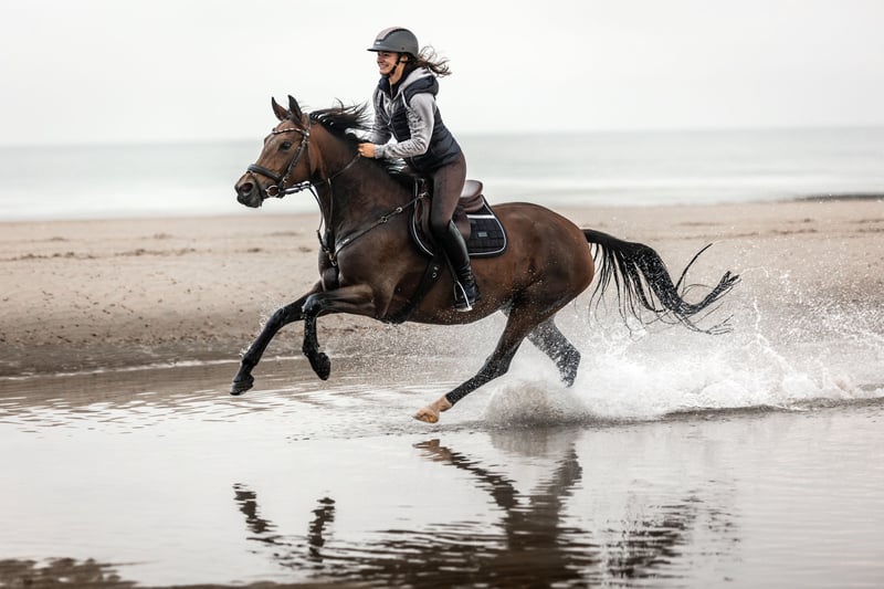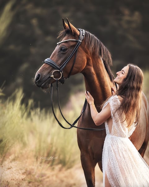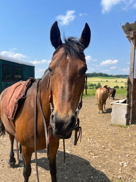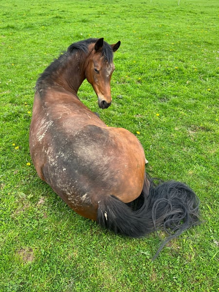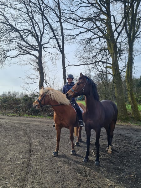 Paola is an absolute dream pony when she has the right person by her side. She is affectionate and motivated. She has been trained up to dressage level L** and can jump an A-level course. Paola is comfortable riding alone or in a group in the field. She can be ridden in a halter and also work as a lead pony. She has also had her first experiences with liberty work. Paola has a high percentage of Thoroughbred blood, which gives her plenty of energy both in the arena and in the field, especially when jumping. Nevertheless, she is always manageable. Unfortunately, Paola is somewhat nervous around other horses when riding. While she is used to a full indoor arena and a busy riding yard, she doesn’t feel entirely comfortable with too much hustle and bustle. For this reason, she is not being sold as a competition pony. Paola is perfect for an engaged and experienced leisure rider who enjoys training but has no ambitions for competition, or for someone who simply loves hacking out or doing liberty work. We are looking for a species-appropriate and caring environment for her. Please note! Paola is currently in foal and therefore not in training. Her foal is expected in May. Paola is not suitable as a children's pony. We have already taken her to the beach in the Netherlands and to the mudflats in Cuxhaven, both of which she loved. She is farrier- and loading-friendly.